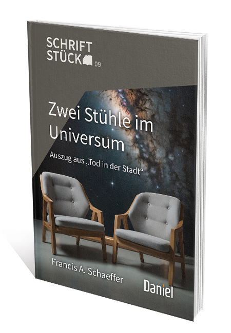 Auszug aus "Tod in der Stadt", F. A. Schaeffer Francis A. Schaeffer war ein brillianter Denker. So sah er in seinem Buch „Wie können wir denn leben?“ eine antigöttliche Entwicklung voraus und umriss sie klar.In diesem Heft geht es nun um einen Auszug aus seinem Buch „Tod in der Stadt“. Das, was Schaeffer so herausragend macht, ist eben nicht nur sein scharfsinniges Denken, sondern die Fähigkeit, scheinbar komplizierte Sachverhalte einfach und verständlich auszudrücken. Genau das ist ihm in dieser Geschichte so meisterhaft gelungen.All unsere weltanschaulichen Diskussionen lassen sich auf exakt diesen Sachverhalt reduzieren: Es gibt nur zwei Stühle – und die Frage ist, auf welchem der Beiden sitzt du!?20 Seiten, geheftet, DIN A5„Die Schriftstück-Reihe“ – ein Stück Schrift!Echte Schätze – zu klein für ein Buch - und zu wichtig, um vergessen zu werden…