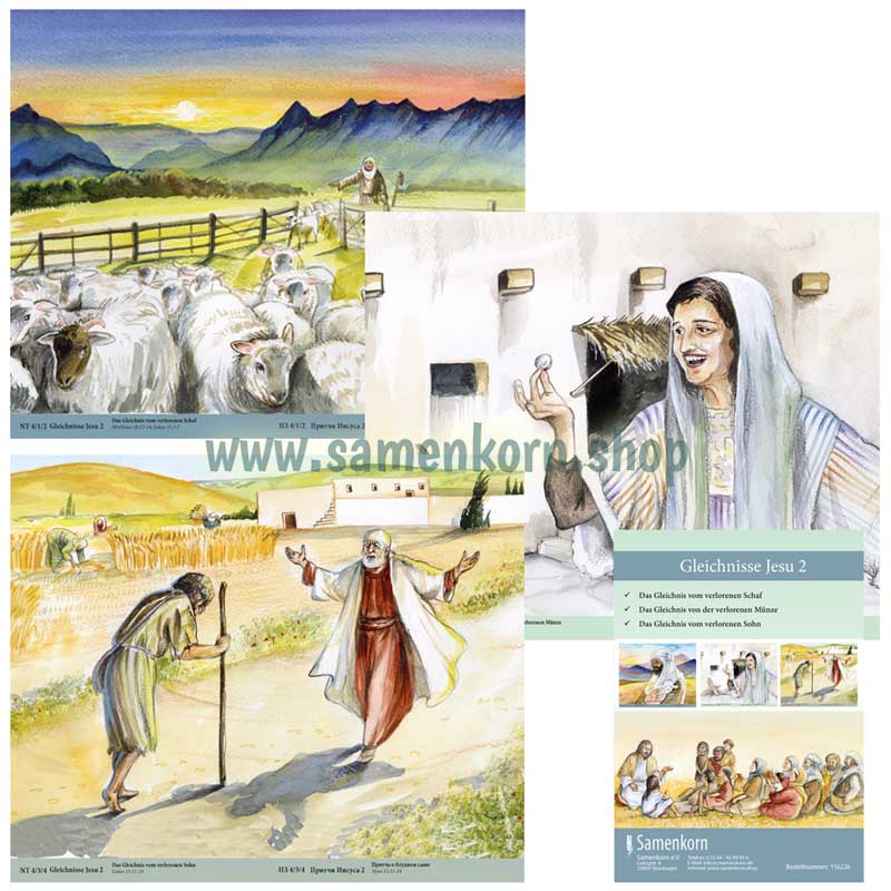 Insgesamt 16 Bilder zu folgenden Gleichnissen:• Das Gleichnis vom verlorenen Schaf (6 Bilder)• Das Gleichnis von der verlorenen Münze (5 Bilder)• Das Gleichnis vom verlorenen Sohn (5 Bilder)Einseitig bedruckt, in einer Folientasche, mit Bildunterschriften in deutscher und russischer SpracheFormat 35 x 42 cm