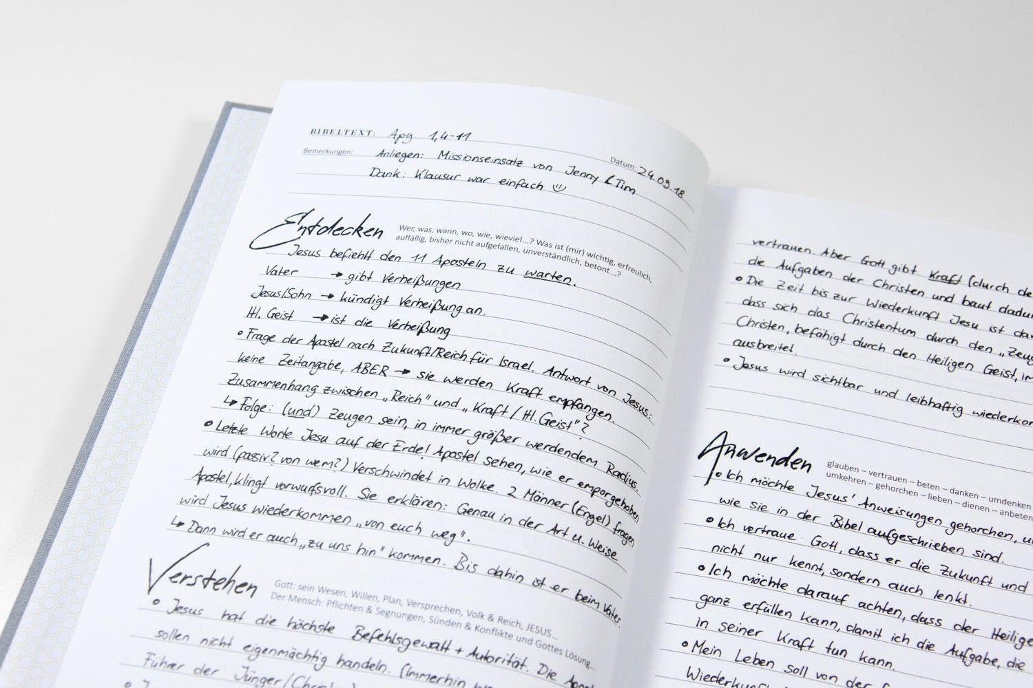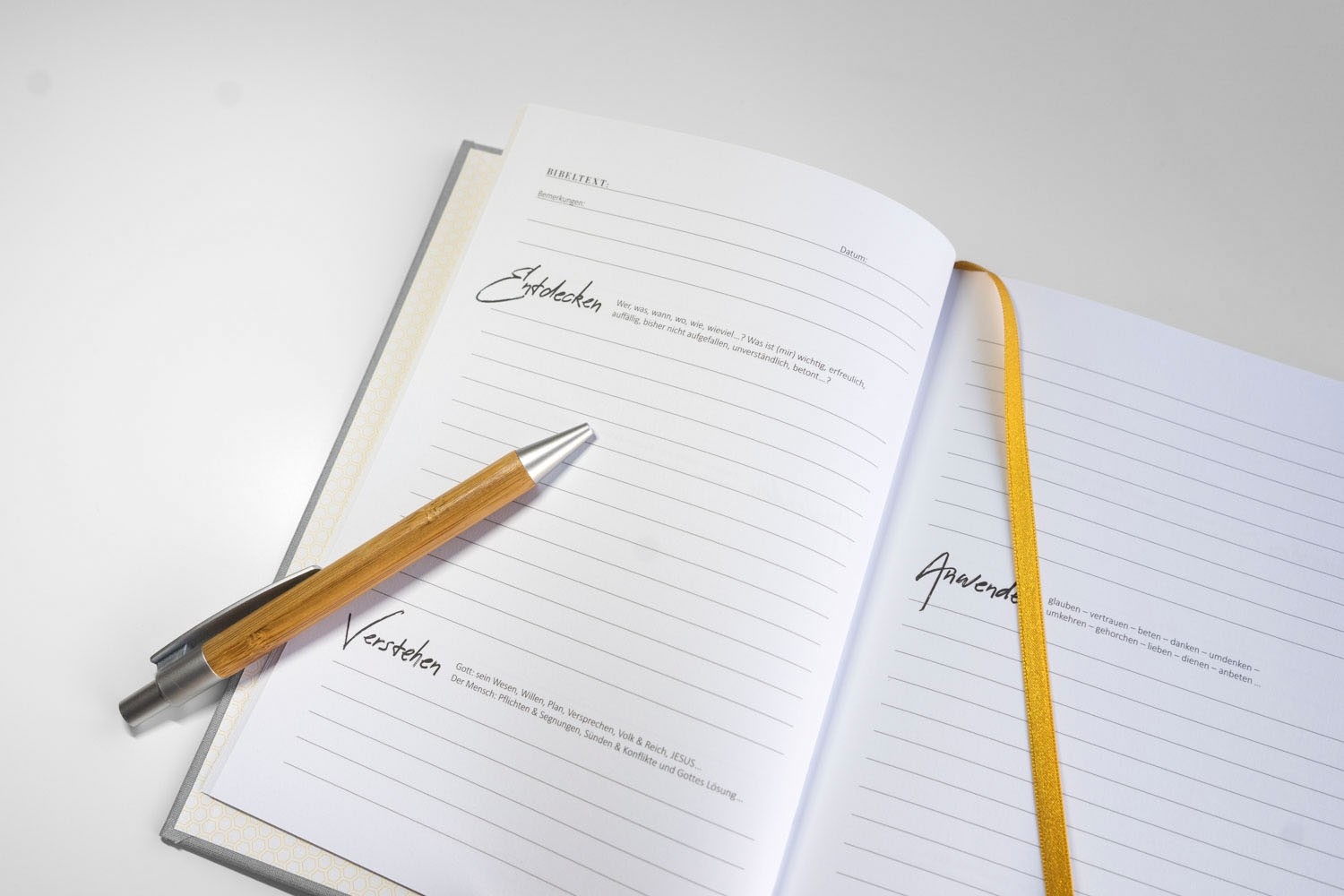 Dieses Notizbuch hilft dir, von der Bibel zu profitieren. Es ist dazu gedacht, bei drei verschiedenen Arten des Genießens von Gottes Wort zu helfen: Einfaches Bibellesen, vertieftes Bibelstudium und Hören von Predigten, Vorträgen, Bibelstunden usw.