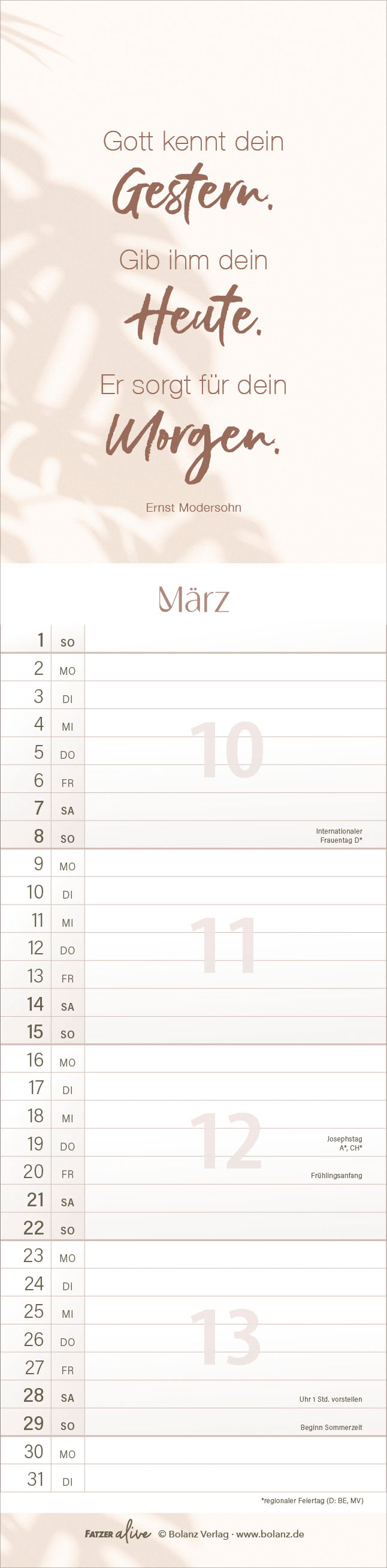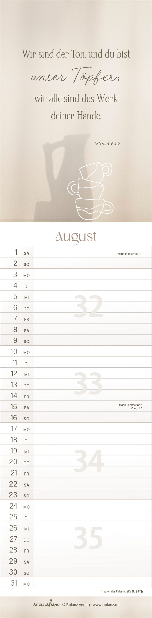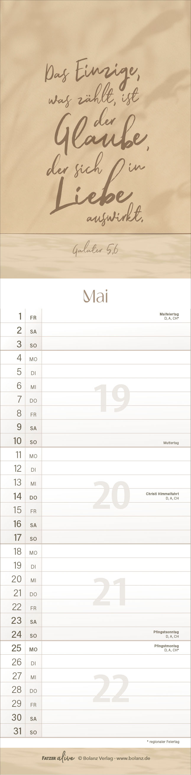 Lass dich von der inspirierten Gestaltung des Streifenkalenders "Erfüllt leben" 2026 begeistern! Dieser elegante Kalender aus der Fatzer Alive Serie verbindet praktische Organisation mit täglicher Ermutigung. Auf jedem Monatsstreifen findest du ausgewählte Bibelverse, die dir Hoffnung, Ermutigung und Inspiration für den Alltag schenken. Erlebe, wie du deinen Glauben in den täglichen Ablauf integrierst und die kleinen Wunder des Lebens neu entdeckst.