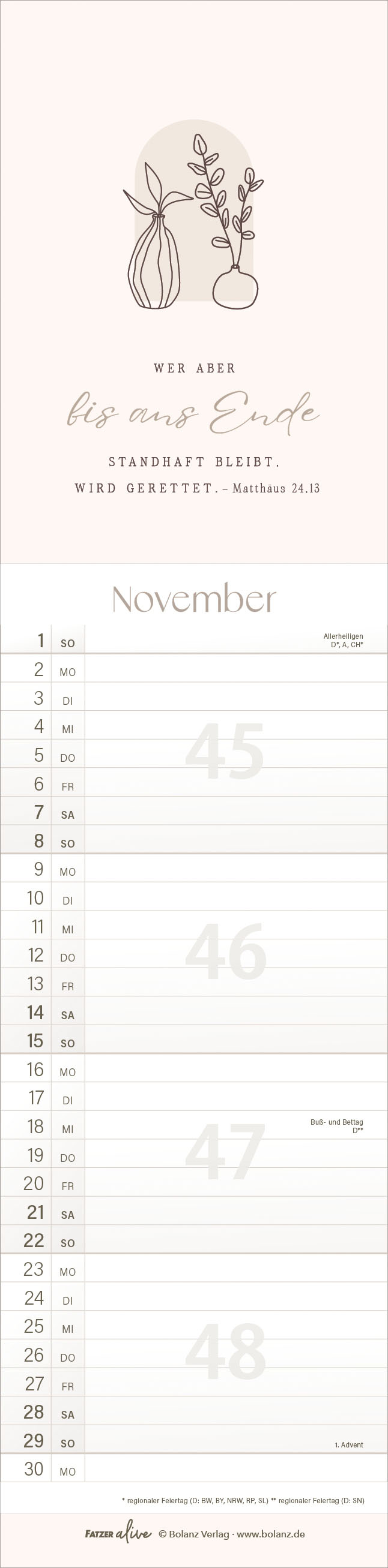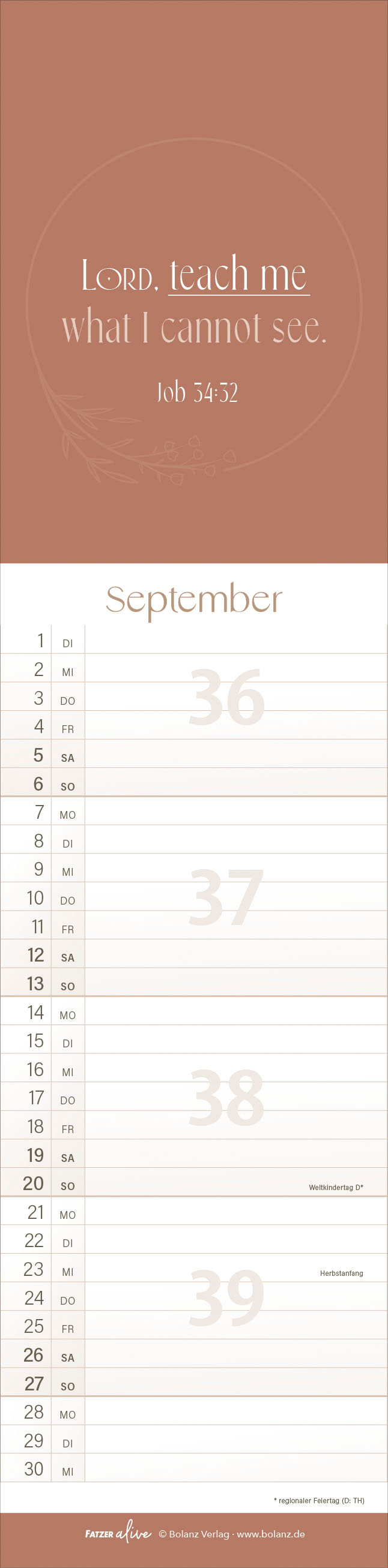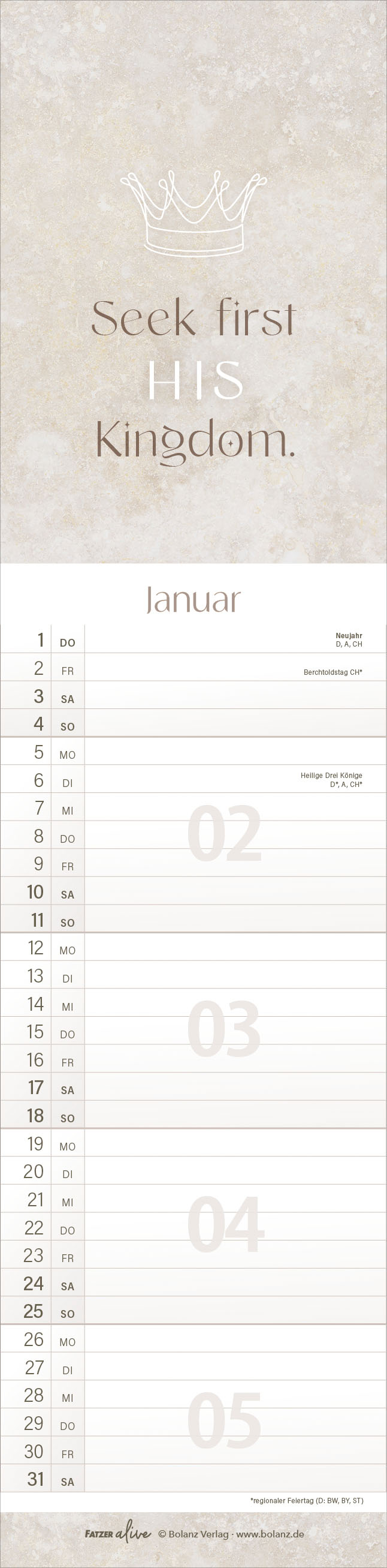 Lass dich von der inspirierten Gestaltung des Streifenkalenders "Erfüllt leben" 2026 begeistern! Dieser elegante Kalender aus der Fatzer Alive Serie verbindet praktische Organisation mit täglicher Ermutigung. Auf jedem Monatsstreifen findest du ausgewählte Bibelverse, die dir Hoffnung, Ermutigung und Inspiration für den Alltag schenken. Erlebe, wie du deinen Glauben in den täglichen Ablauf integrierst und die kleinen Wunder des Lebens neu entdeckst.