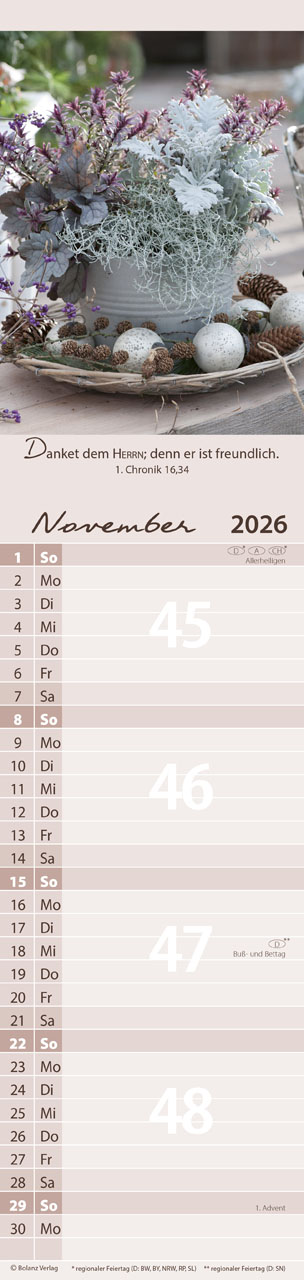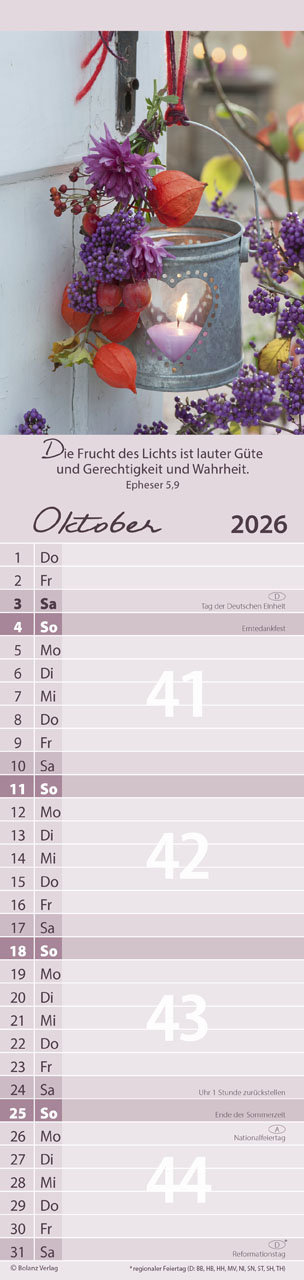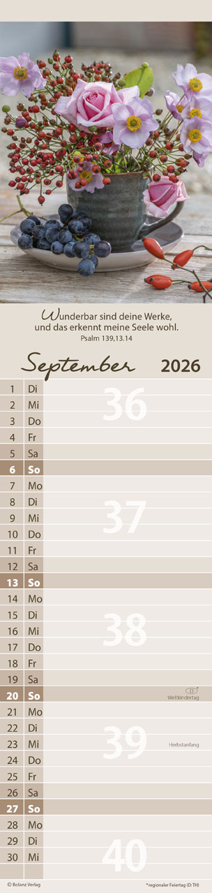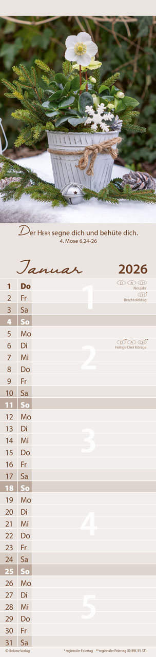 Mit einem übersichtlichen Kalendarium und viel Platz für deine Notizen kannst du alle wichtigen Termine, Gedanken und Ideen festhalten. Die zwölf Monatsblätter sind so gestaltet, dass du die Bibelworte ganz einfach als Postkarte ausschneiden und verschenken kannst. Zudem erwarten dich auf den Rückseiten köstliche Rezepte sowie praktische Buch- und Geschenketipps, die deine Kreativität anregen.