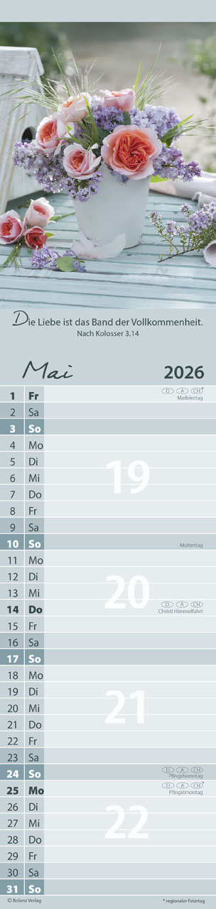 Entdecke den Streifenterminplaner "Von mir zu Dir" 2026, der deinem Alltag mit fröhlichen, bunten Blumenbildern einen lebendigen Farbtupfer verleiht! Dieser Kalender bringt nicht nur Farbe in dein Leben, sondern begeistert auch mit ermutigenden Bibelversen, die dich jeden Monat aufs Neue inspirieren.