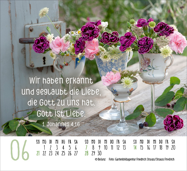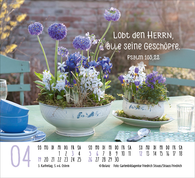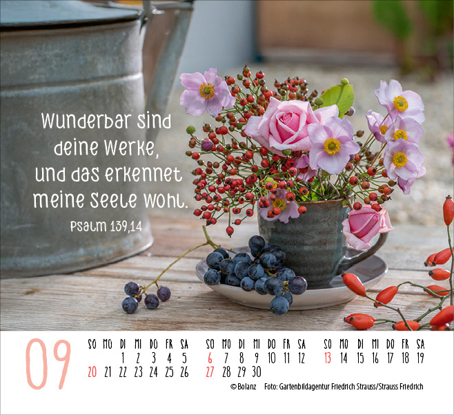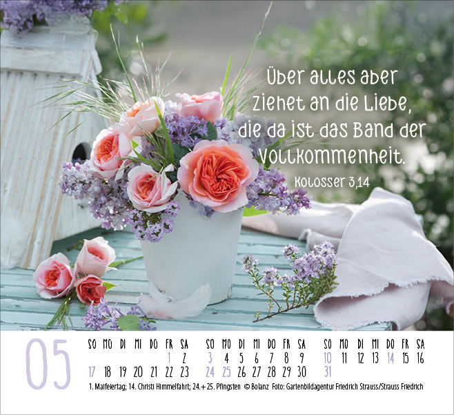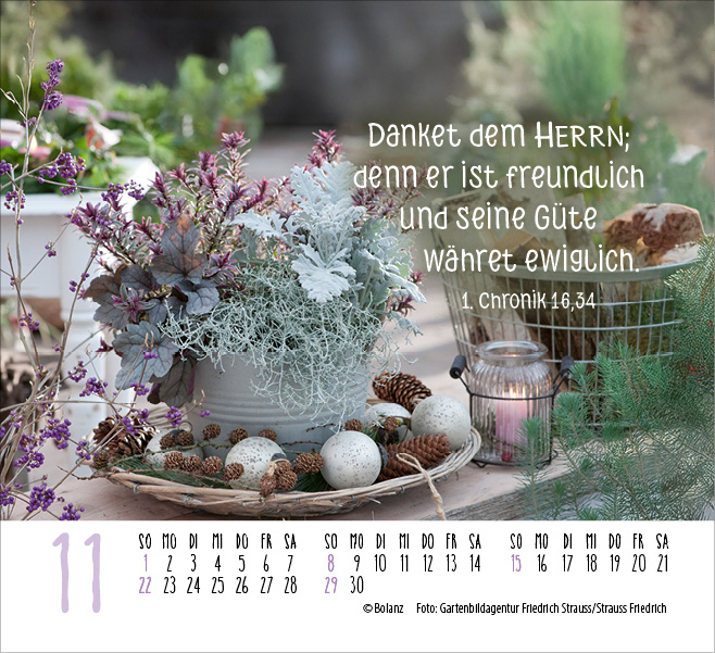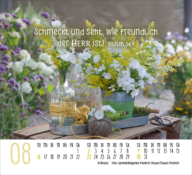 Die liebevoll ausgewählten Bibelverse ergänzen die Bilder und bieten dir christliche Impulse, die deine Seele nähren. Ob auf deinem Schreibtisch, im Regal oder als Geschenk für einen lieben Menschen – dieser praktische und schöne Kalender ist vielseitig einsetzbar und immer ein Blickfang.