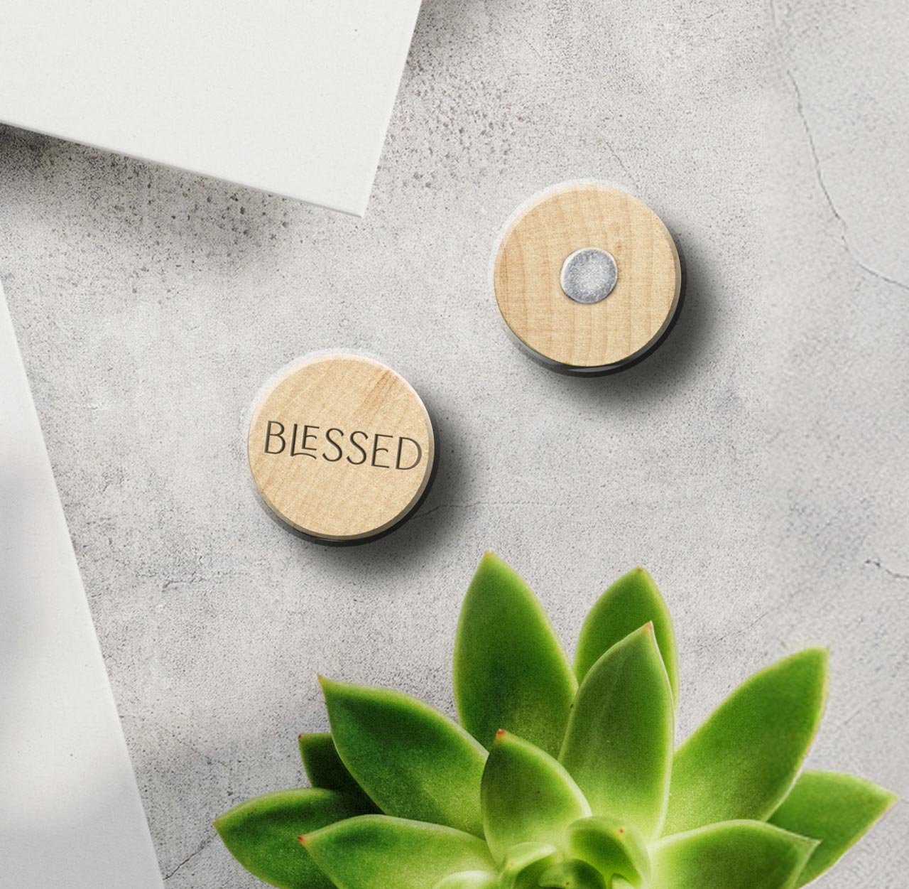Dieser handliche Holzmagnet trägt ein kraftvolles Statement: „blessed“ – gesegnet. Mit seinem schlichten, modernen Design erinnert er im Alltag daran, wie reich beschenkt wir sind. Der runde Magnet ist aus hochwertigem Buchenholz gefertigt, misst 2,5 cm im Durchmesser und ist 1 cm hoch. Die elegante Lasergravur und der dezent eingelassene Magnetpunkt auf der Rückseite machen ihn zum stilvollen Alltagsbegleiter.