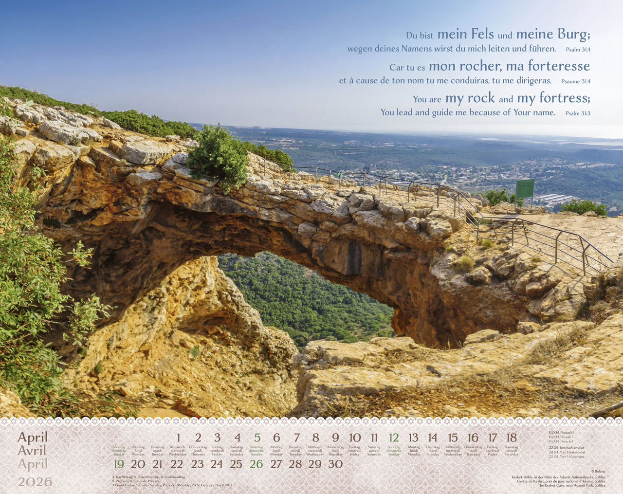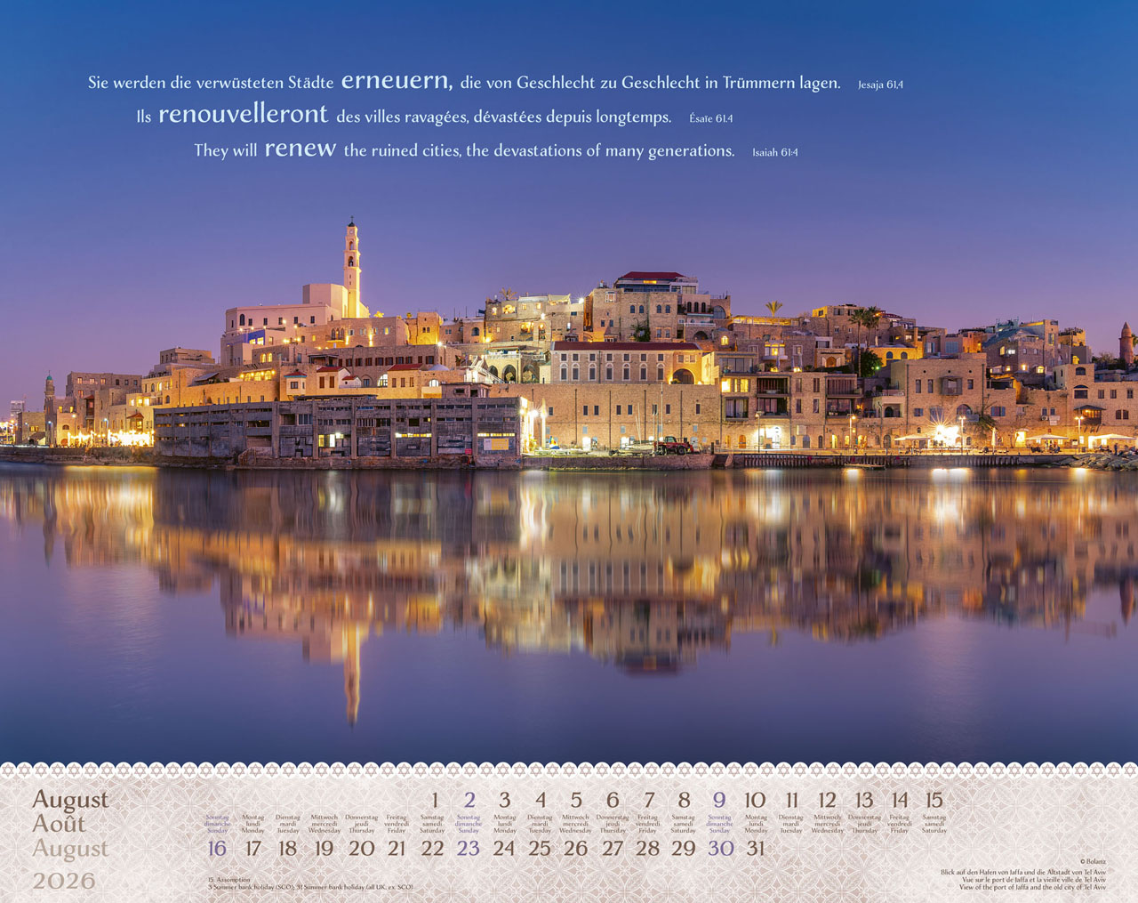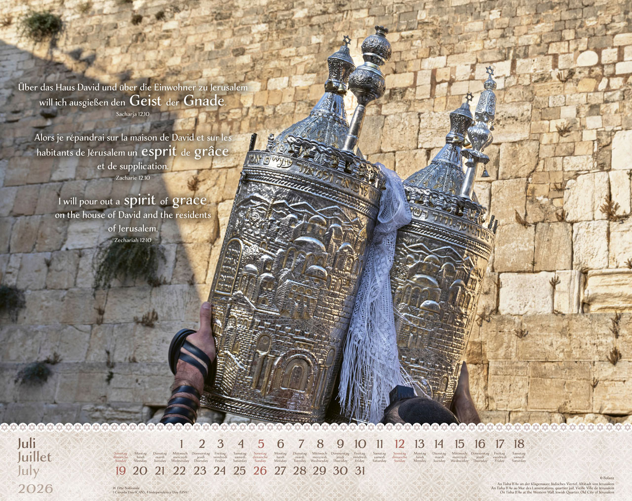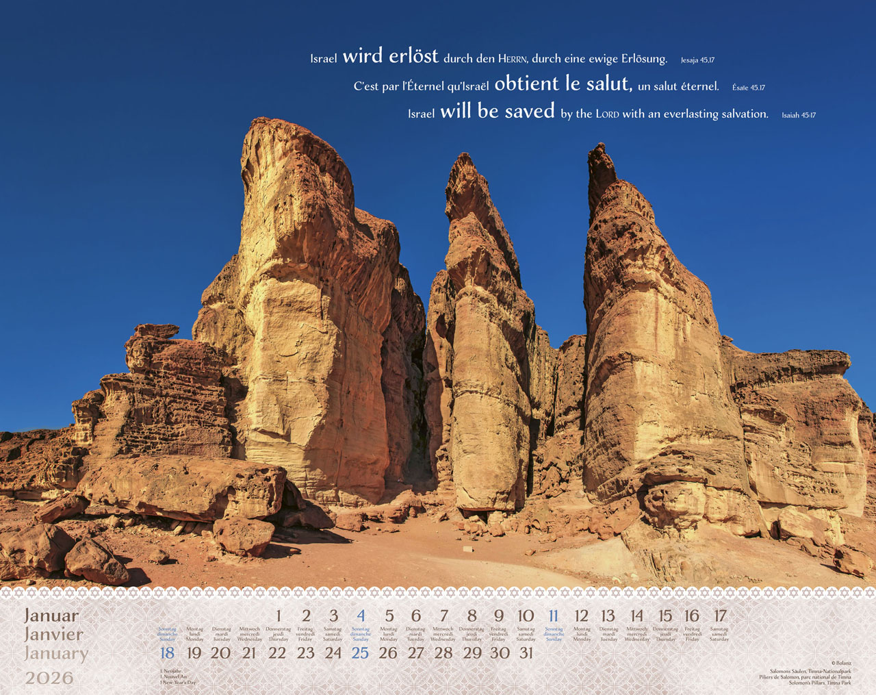 Mit beeindruckenden Fotografien zeigt er die Schönheit und Vielfalt Israels und kombiniert diese mit passenden Bibelversen aus dem Alten Testament in deutscher, englischer und französischer Sprache. Der Titel ist mit edler Metallic-Schmuckfarbe gedruckt, was dem Kalender einen besonderen Glanz verleiht und ihn zu einem stilvollen Element in Deinem Zuhause macht.