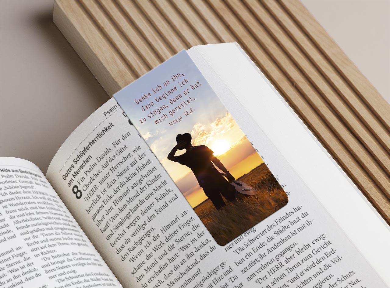Das Magnetlesezeichen mit dem Bibelvers aus Jesaja 12,2 lädt dazu ein, mit neuer Zuversicht durch den Tag zu gehen. Das Motiv zeigt einen Mann mit einer Gitarre in der Hand, der dem Sonnenuntergang entgegenblickt – ein Bild voller Hoffnung, Freiheit und innerer Ruhe. Die Szene vermittelt einen Moment der Dankbarkeit, des Vertrauens und der Verbindung mit dem, was trägt.