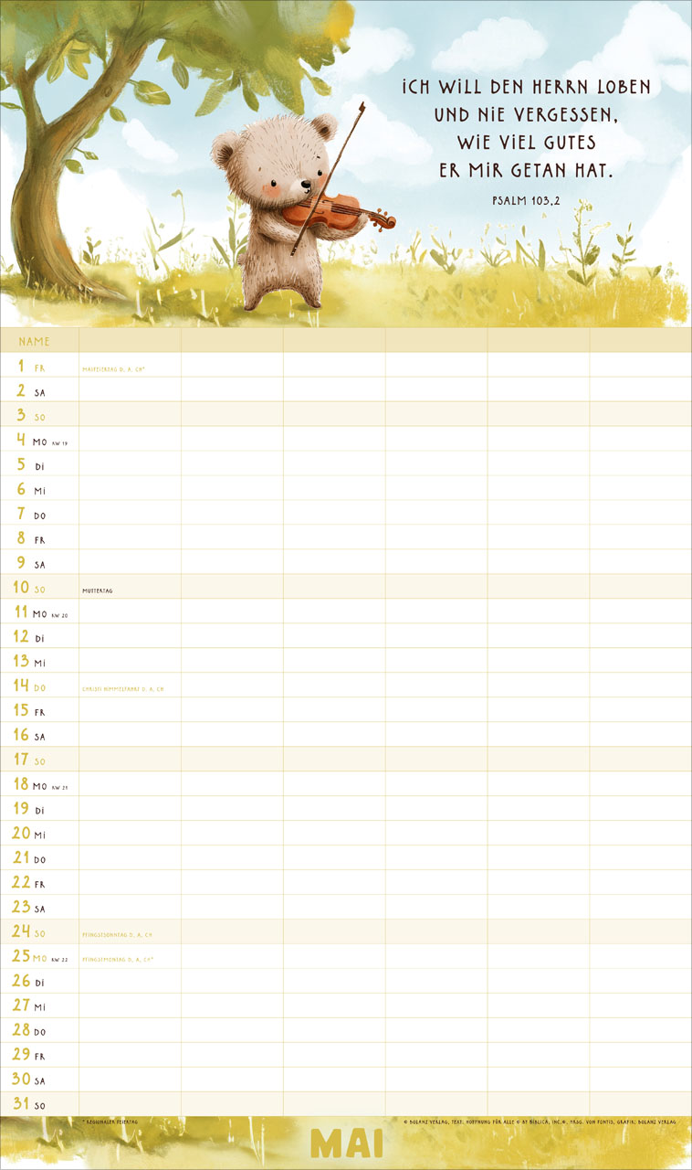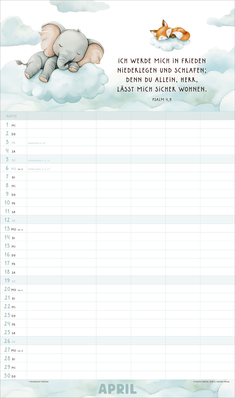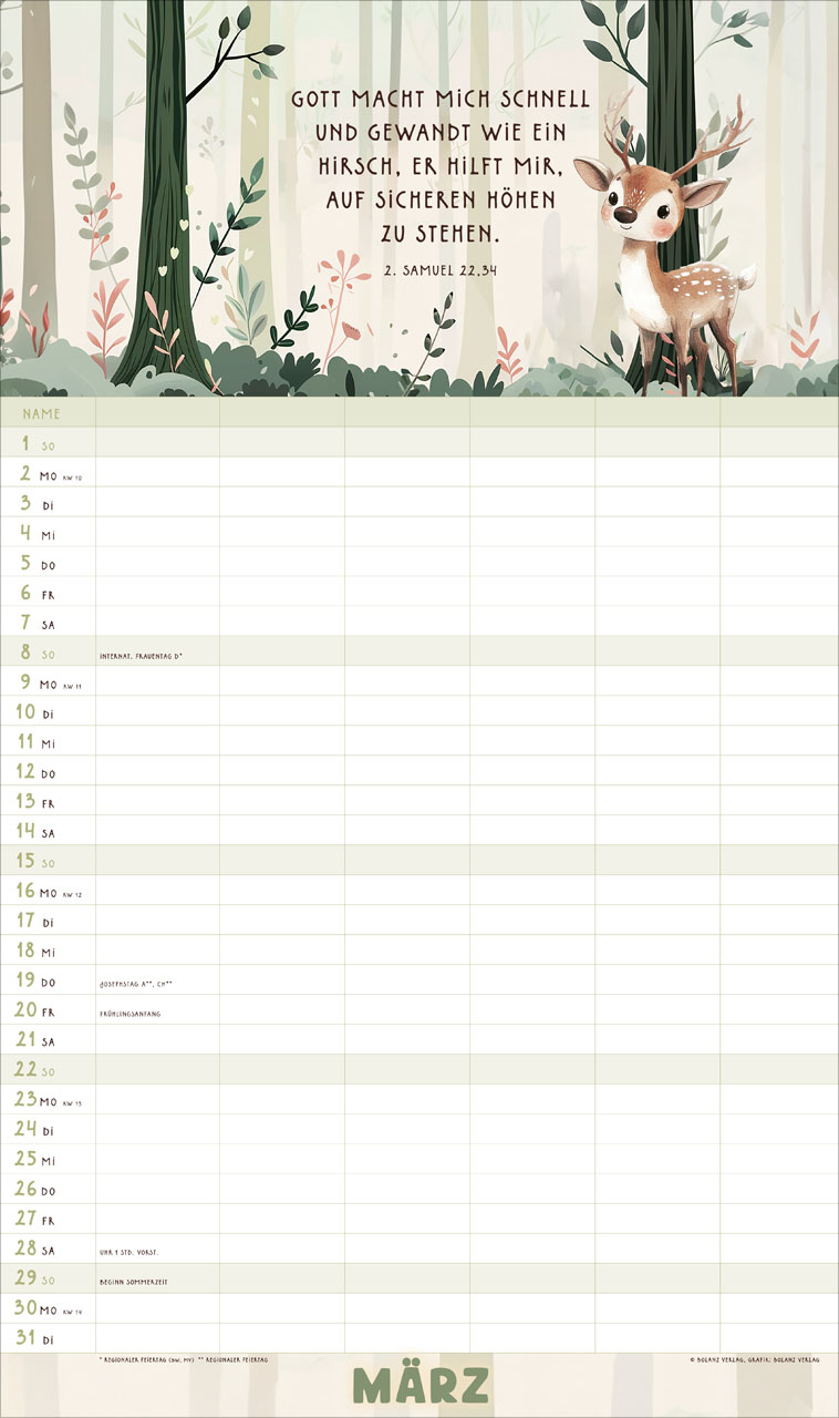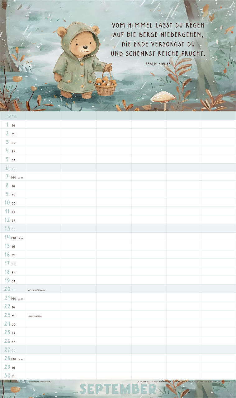 Mit fröhlichen Zeichnungen und inspirierenden Bibelversen wird das Planen zum Vergnügen und bringt eine positive Note in deinen Alltag. Auf dem Rückblatt findest du eine Übersicht der Schulferien sowie eine praktische Jahresvorschau für 2027, die das Planen noch einfacher macht.