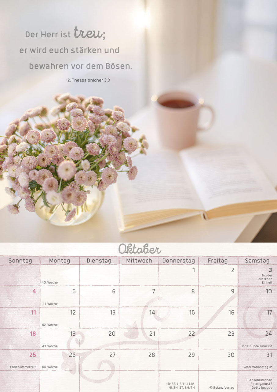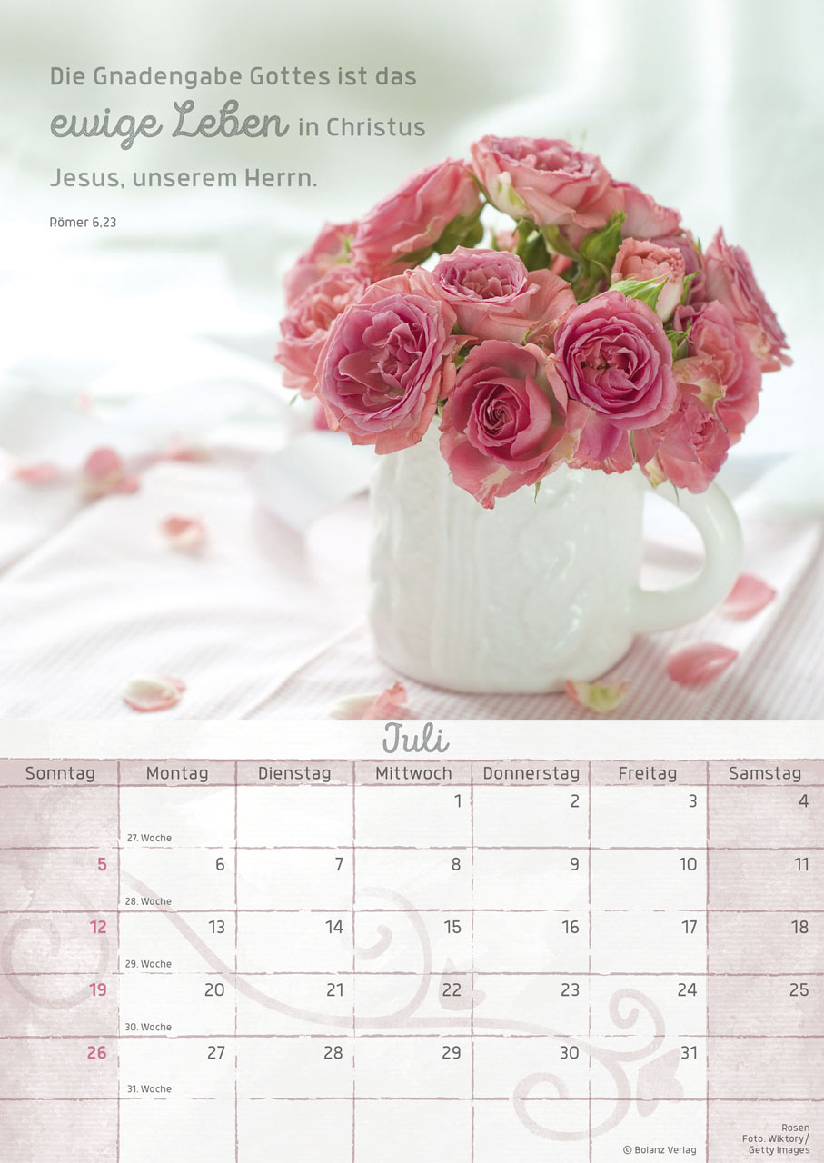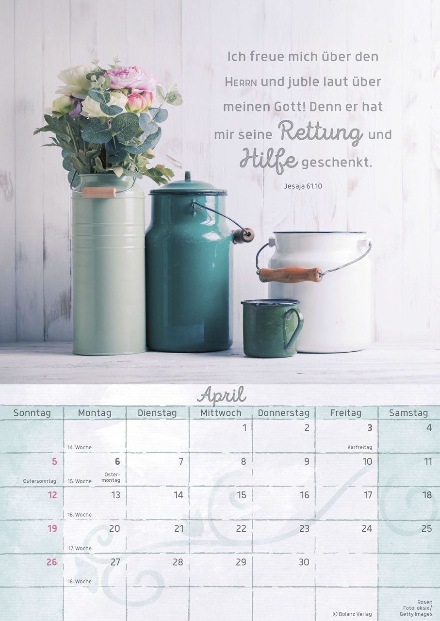 Jeder Monat wird von inspirierenden Worten aus der Bibel begleitet, die die Freude an Gottes Wort vermitteln und dich dazu anregen, die kleinen Wunder des Lebens zu schätzen. Mit einem handlichen Format von 22,3 x 31,5 cm findet dieser Kalender überall einen schönen Platz in deinem Zuhause. Die praktische Spiralbindung und der Aufhängebügel ermöglichen es dir, den Kalender ganz einfach aufzuhängen und jeden Monat die neuen Motive zu genießen.