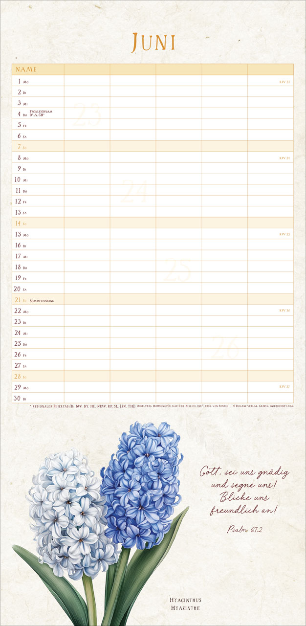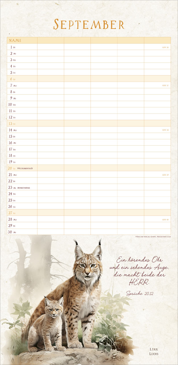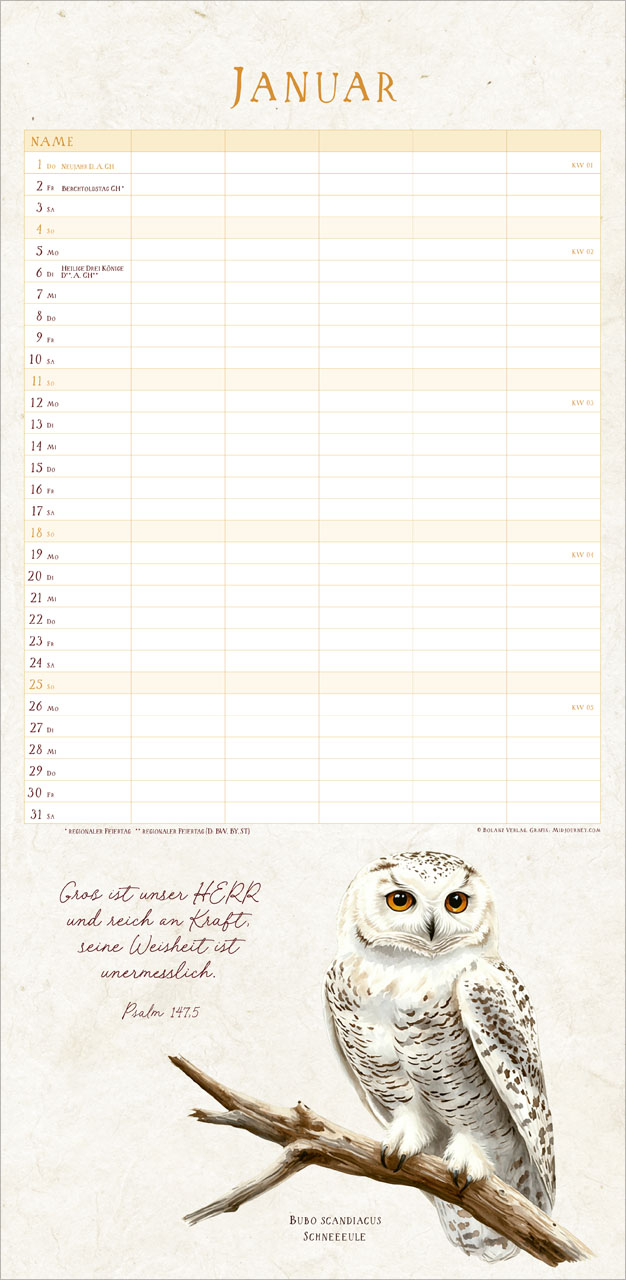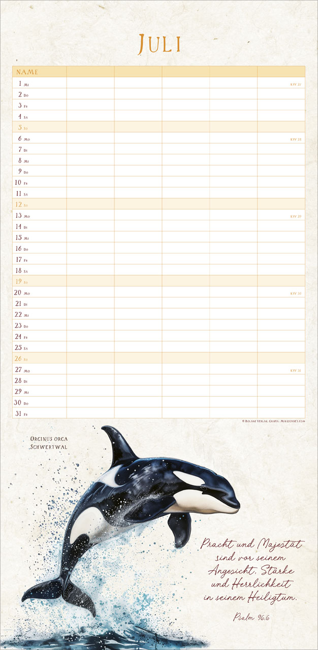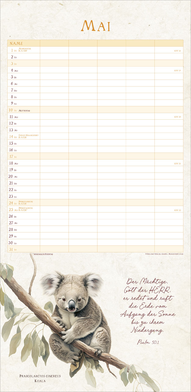 Erlebe die Schönheit von Tier- und Pflanzenwelt mit dem Familienplaner "NaturWunder des Schöpfers" 2026. Dieser besondere Kalender zeigt Dir und Deiner Familie jeden Monat eindrucksvolle Illustrationen aus der Natur, die nicht nur zum Staunen einladen, sondern durch passende Bibelverse auch zum Innehalten und Nachdenken anregen. So wird jeder Monat zu einer Quelle der Inspiration und Freude.