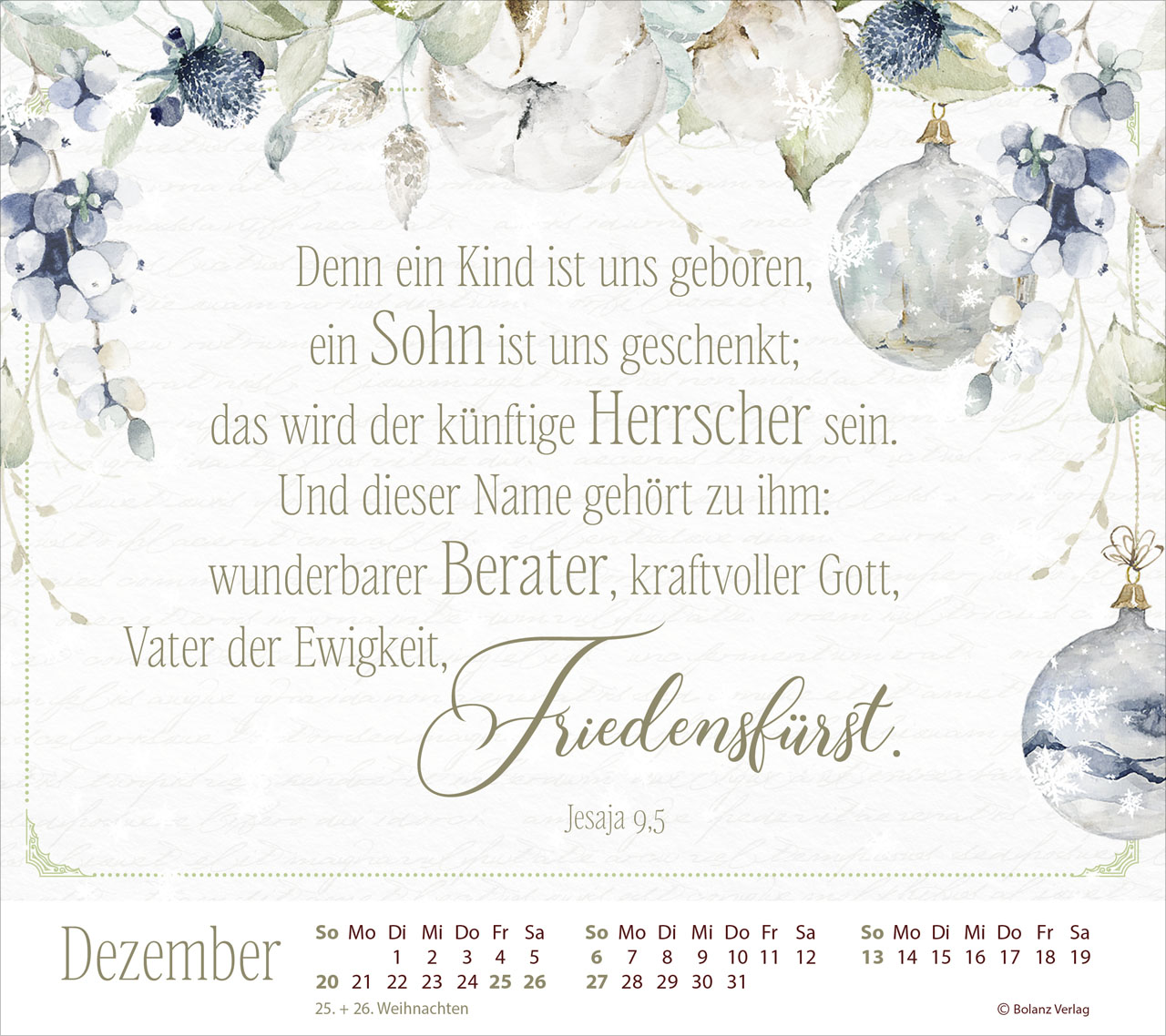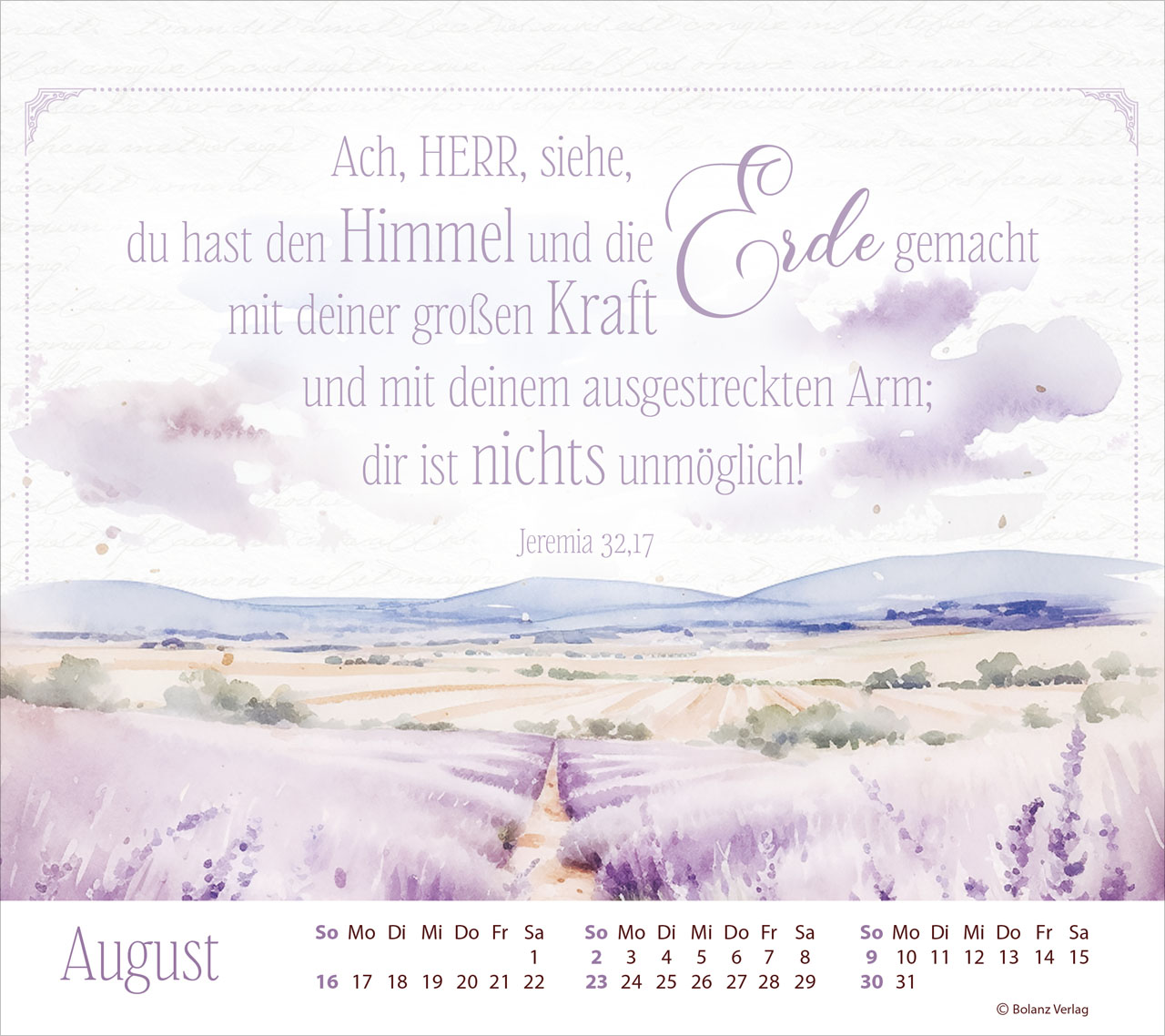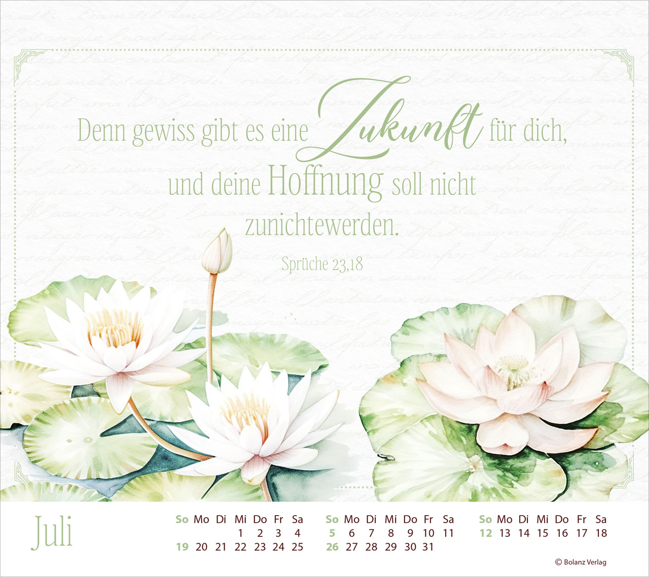 Jeder Monat wird von einem kraftvollen Bibelvers begleitet, der Dich dazu einlädt, innezuhalten und neue Hoffnung zu schöpfen. Dank der praktischen Spiralbindung und des stabilen Aufstellers ist der Kalender nicht nur ein funktionales Hilfsmittel, sondern auch ein stilvoller Blickfang auf Deinem Tisch oder Regal.