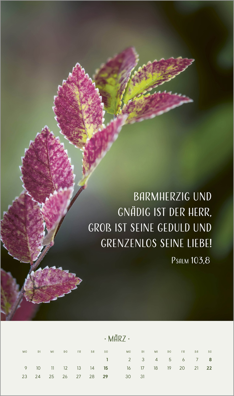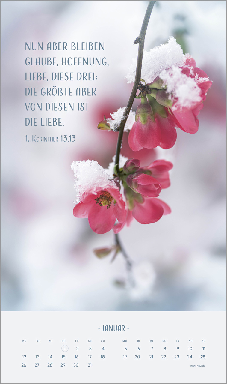 Neben dem Posterkalender ist dieser Kalender auch als Tischkalender sowie als Tischkalender mit Holzaufsteller erhältlich. So kannst Du die inspirierenden Motive überall bei Dir haben und Dich das ganze Jahr über von den sanften Farben und den ermutigenden Bibelversen begleiten lassen. Genieße die kleinen Wunder des Alltags und lass Dich von der Schönheit der Natur und den positiven Worten inspirieren!