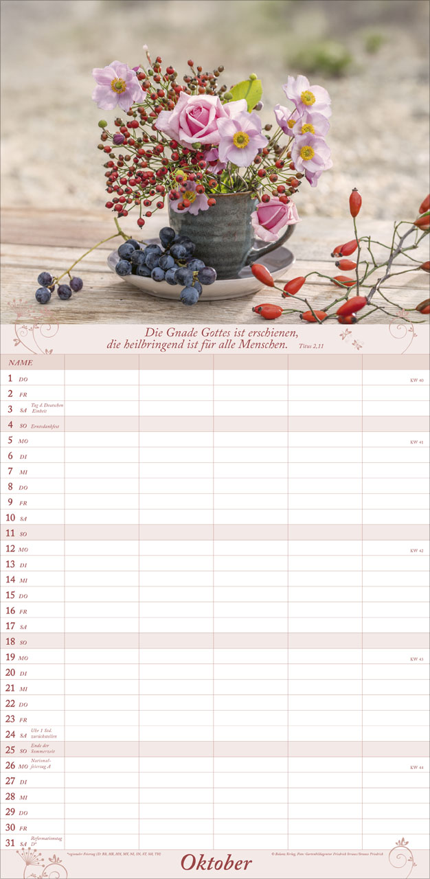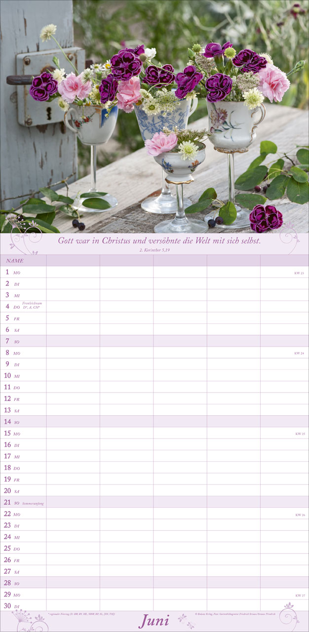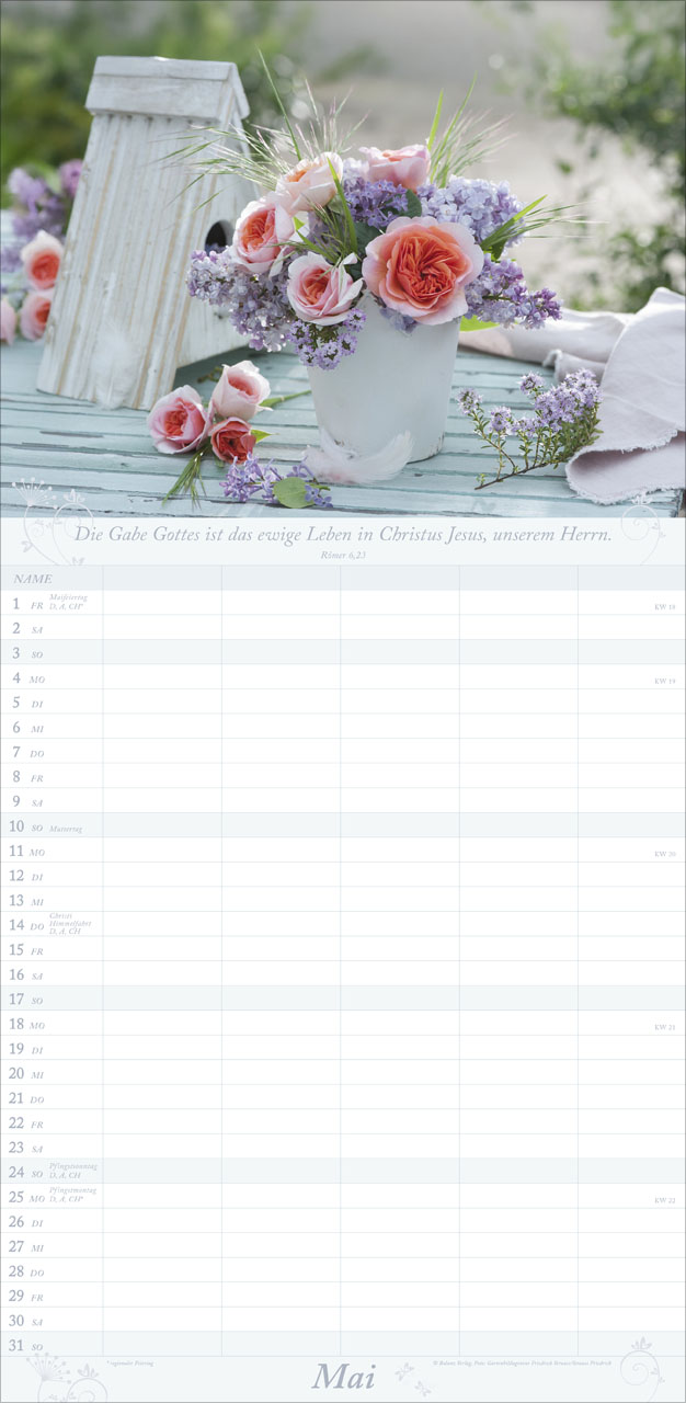 Jeder Monat des Familienplaners "Im Garten zuhause" wird durch wunderschöne Gartenfotos und inspirierende Bibelverse bereichert, die dich an die Ruhe und den Frieden des Gartens erinnern. Die Kombination aus funktionalem Design und ästhetischem Charme macht diesen Kalender zu einem unverzichtbaren Helfer im Alltag – und bringt dir gleichzeitig die beruhigende Atmosphäre des Gartens ins Zuhause.