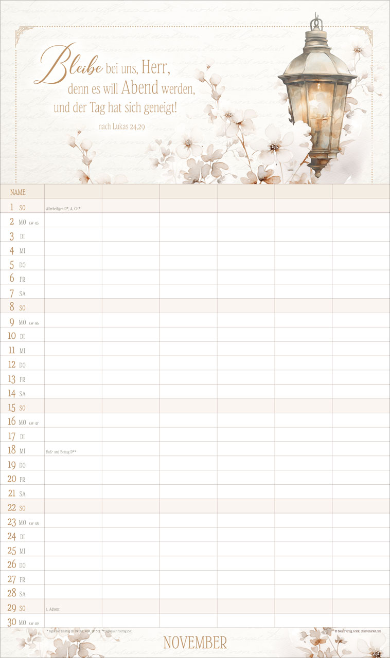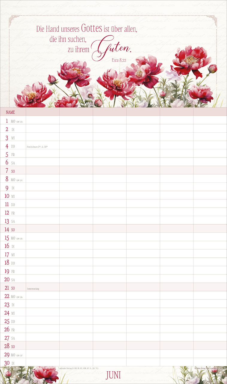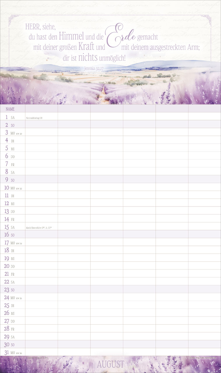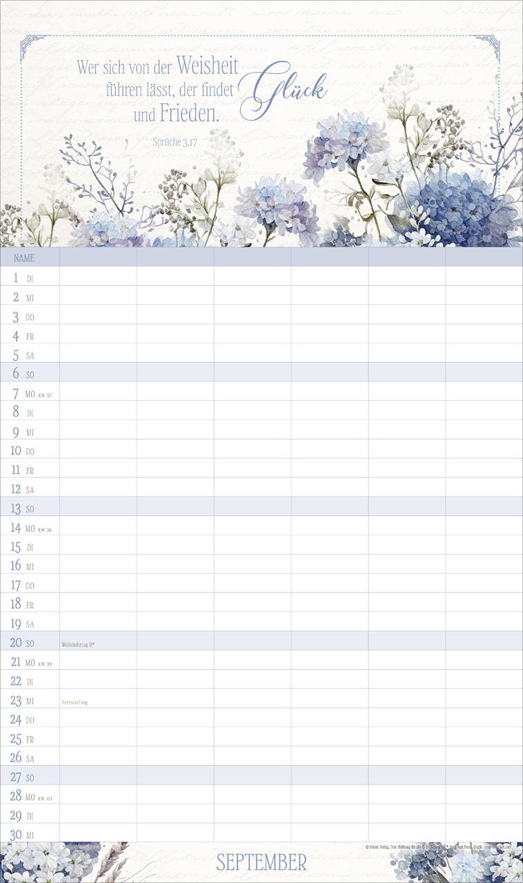 Auf jedem Monatsblatt findest Du inspirierende Bibelverse, die eine positive Atmosphäre schaffen und Euch daran erinnern, den Fokus auf das Wesentliche zu legen. Der Kalender enthält zudem Schulferien auf dem Rückblatt sowie eine Jahresvorschau für 2027, damit Ihr immer den Überblick behaltet und rechtzeitig planen könnt.