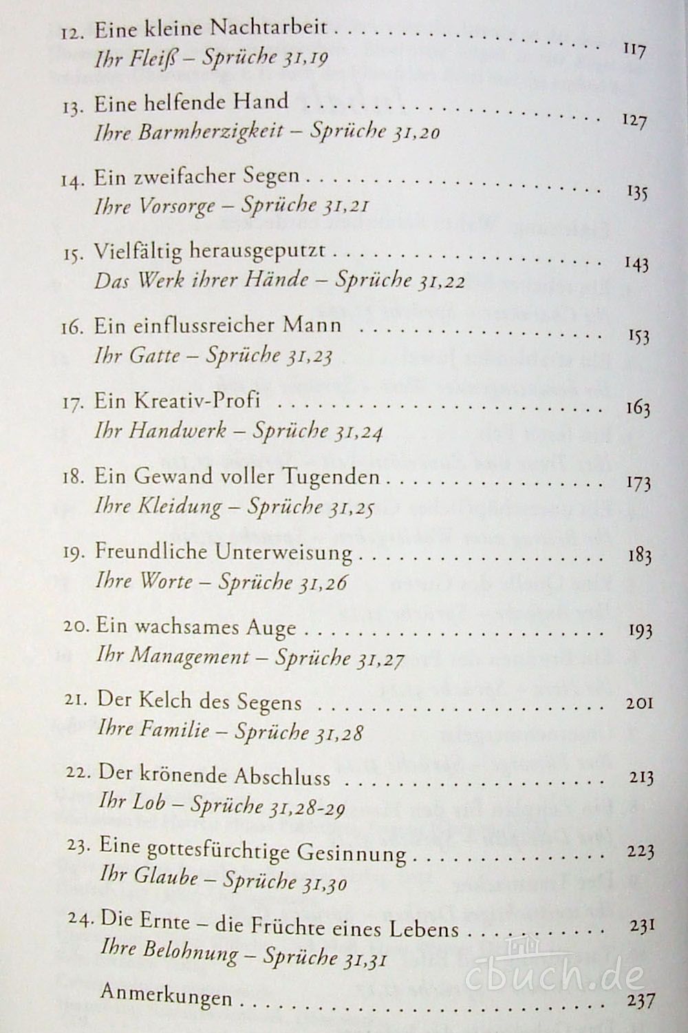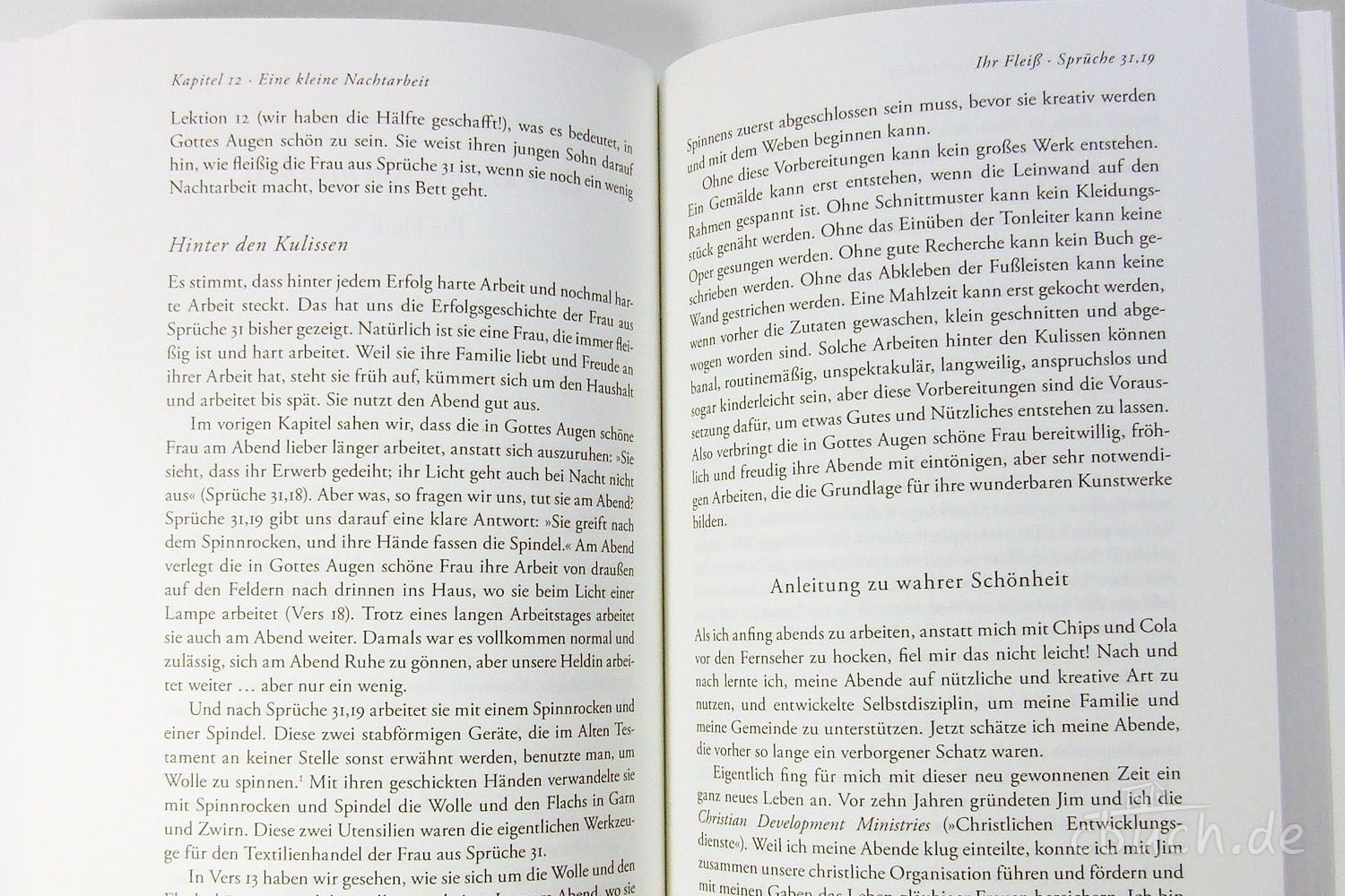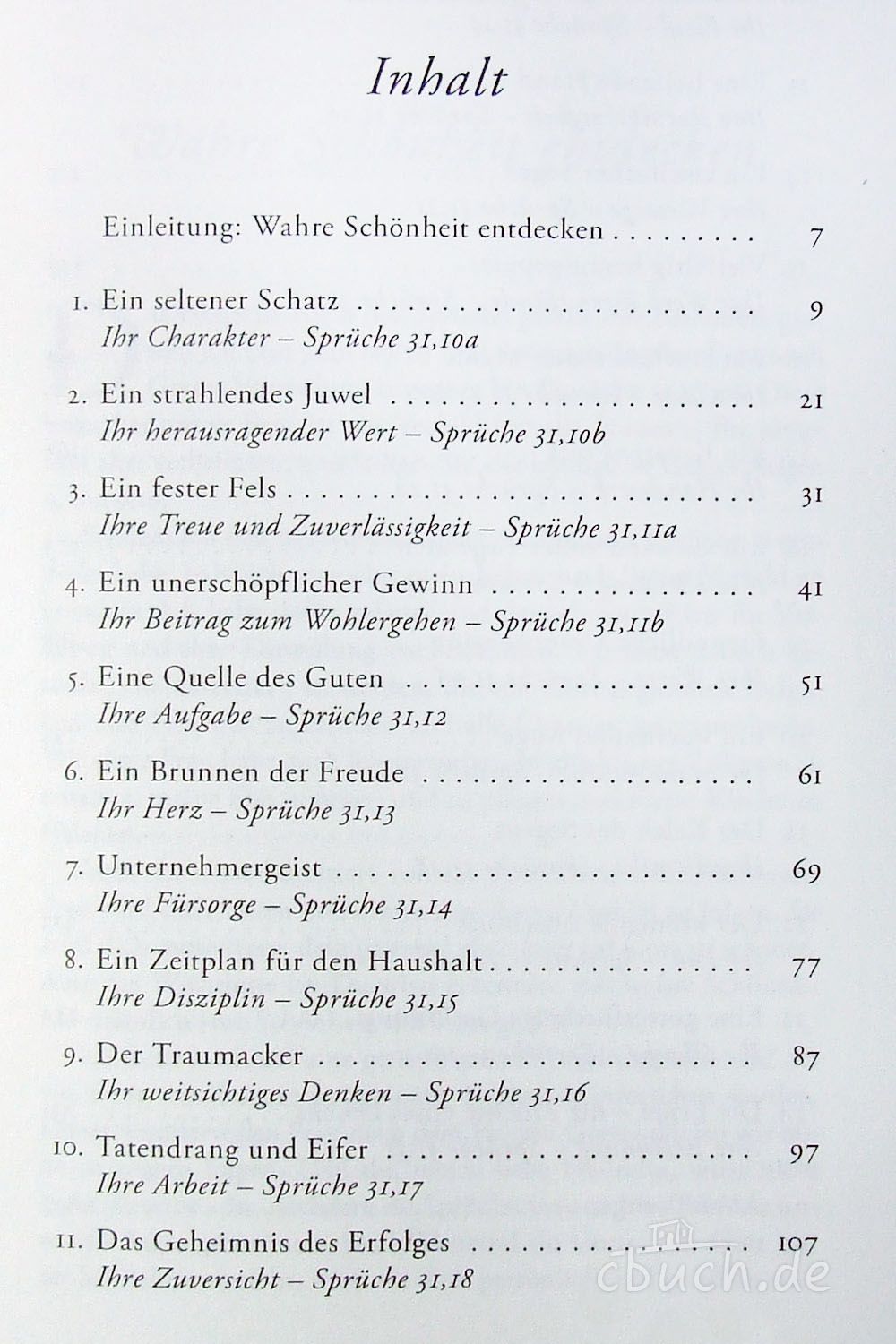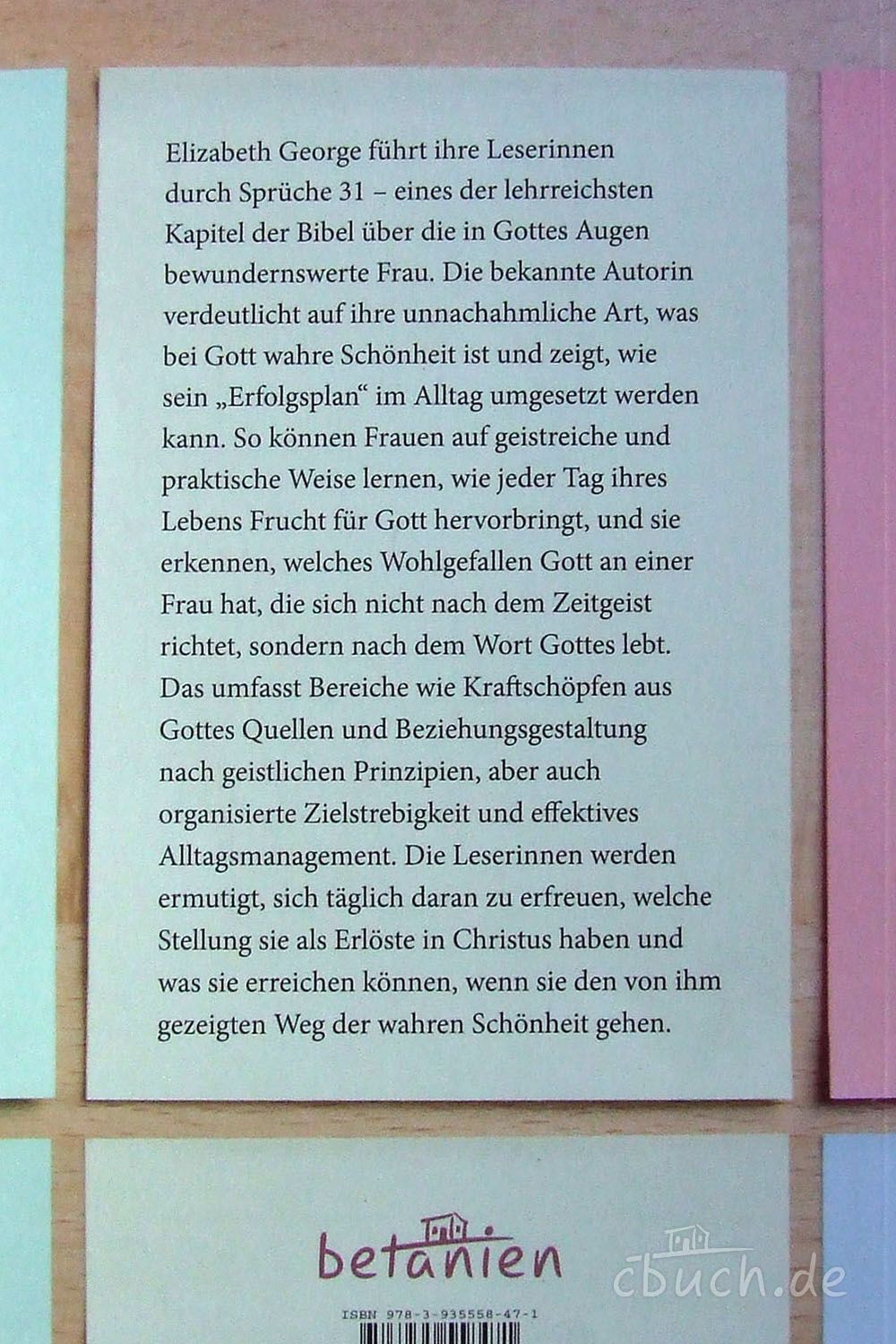 Elizabeth George führt ihre Leserinnen durch Sprüche 31 – eines der lehrreichsten Kapitel der Bibel über die in Gottes Augen bewundernswerte Frau. Die bekannte Autorin verdeutlicht auf ihre unnachahmliche Art, was bei Gott wahre Schönheit ist und zeigt, wie sein „Erfolgsplan“ im Alltag umgesetzt werden kann. So können Frauen auf geistreiche und praktische Weise lernen, wie jeder Tag ihres Lebens Frucht für Gott hervorbringt, und sie erkennen, welches Wohlgefallen Gott an einer Frau hat, die sich nicht nach dem Zeitgeist richtet, sondern nach dem Wort Gottes lebt. Das umfasst Bereiche wie Kraftschöpfen aus Gottes Quellen und Beziehungsgestaltung nach geistlichen Prinzipien, aber auch organisierte Zielstrebigkeit und effektives Alltagsmanagement. Die Leserinnen werden ermutigt, sich täglich daran zu erfreuen, welche Stellung sie als Erlöste in Christus haben und was sie erreichen können, wenn sie den von ihm gezeigten Weg der wahren Schönheit gehen.