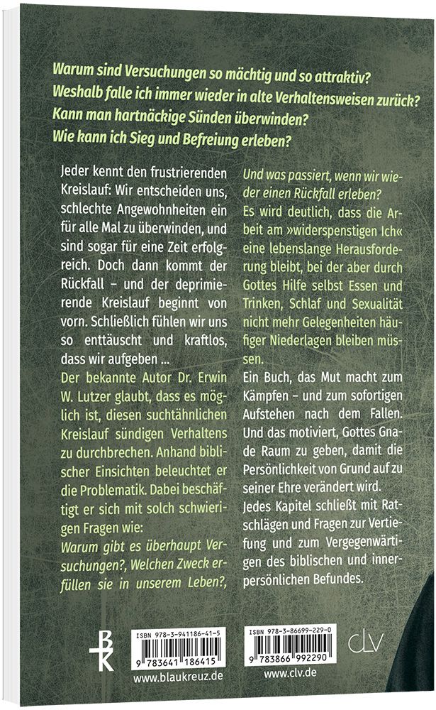 Der bekannte Autor Dr. Erwin W. Lutzer glaubt, dass es möglich ist, diesen suchtähnlichen Kreislauf sündigen Verhaltens zu durchbrechen. Anhand biblischer Einsichten beleuchtet er die Problematik. Dabei beschäftigt er sich mit solch schwierigen Fragen wie: »Warum gibt es überhaupt Versuchungen?«, »Welchen Zweck erfüllen sie in unserem Leben?«, »Und was passiert, wenn wir wieder einen Rückfall erleben?« Es wird deutlich, dass die Arbeit am »widerspenstigen Ich« eine lebenslange Herausforderung bleibt, bei der aber durch Gottes Hilfe selbst Essen und Trinken, Schlaf und Sexualität nicht mehr Gelegenheiten häufiger Niederlagen bleiben müssen.