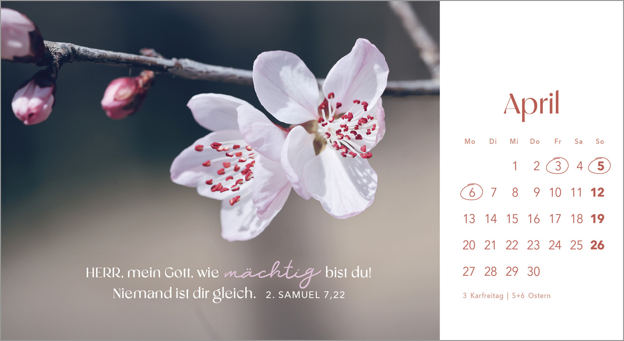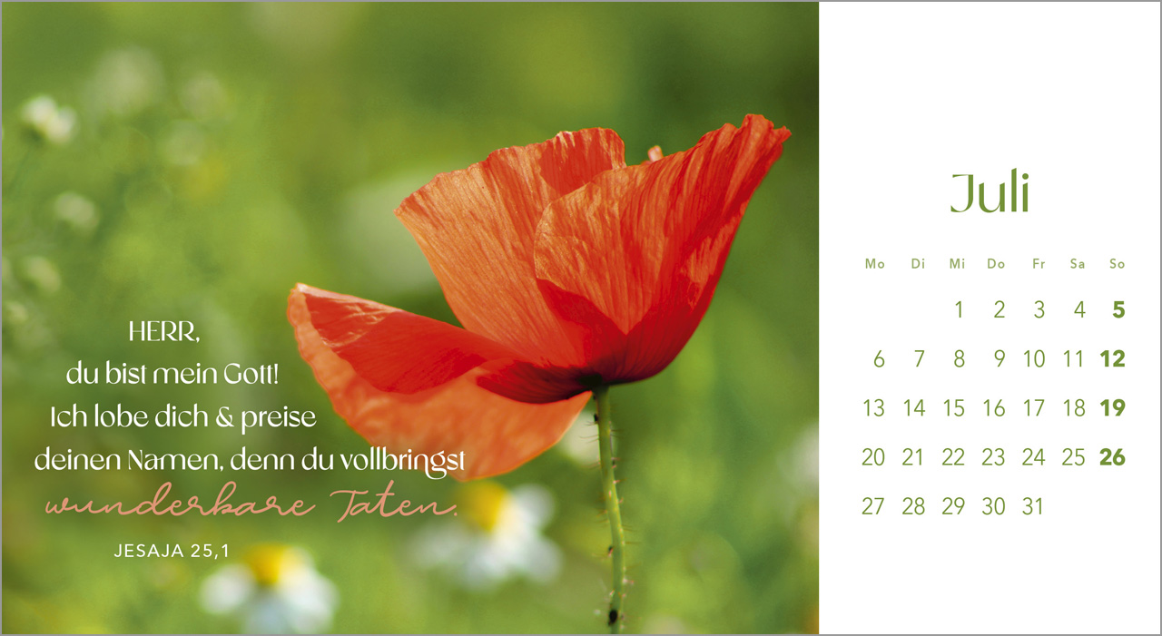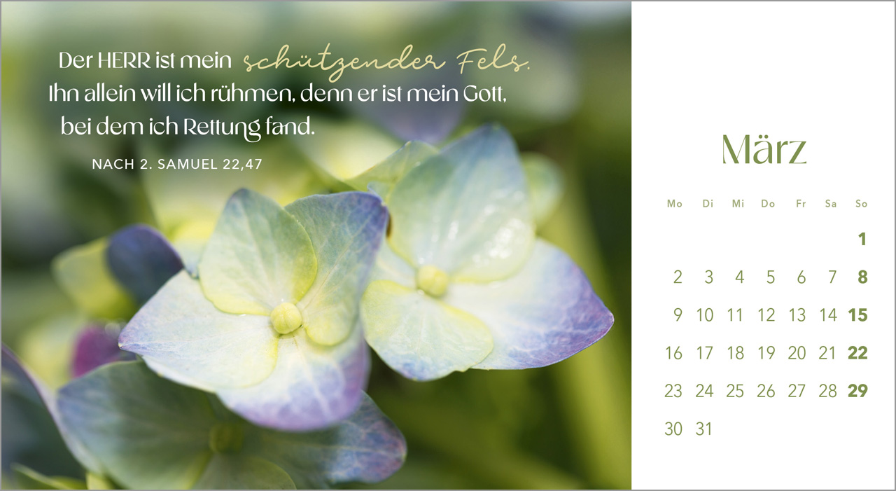 Sobald ein Monat vorüber ist, kannst du die liebevoll gestalteten Blumenbilder einfach als Postkarten ausschneiden und an deine Liebsten verschicken. So teilst du nicht nur deine Freude an der Natur, sondern auch die ermutigenden Worte der Bibel.