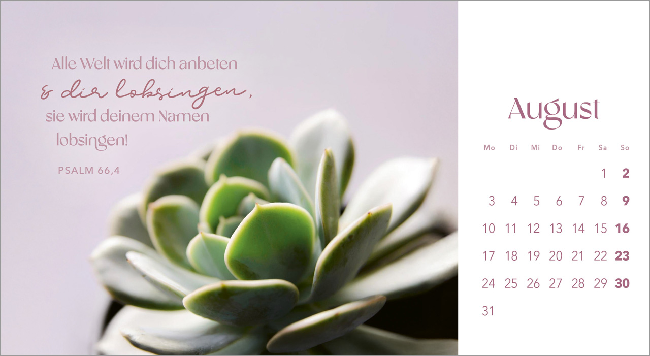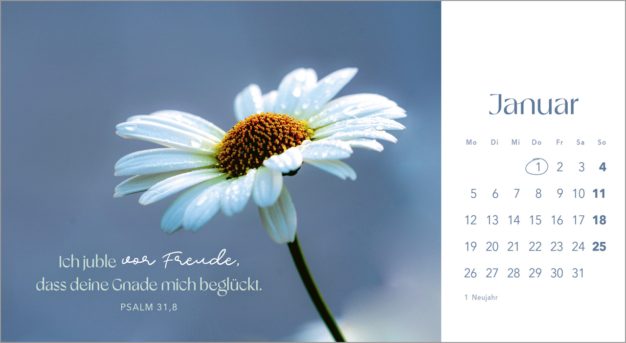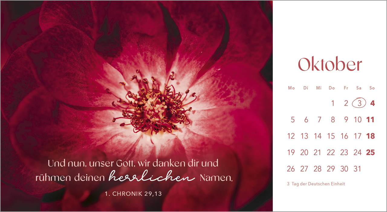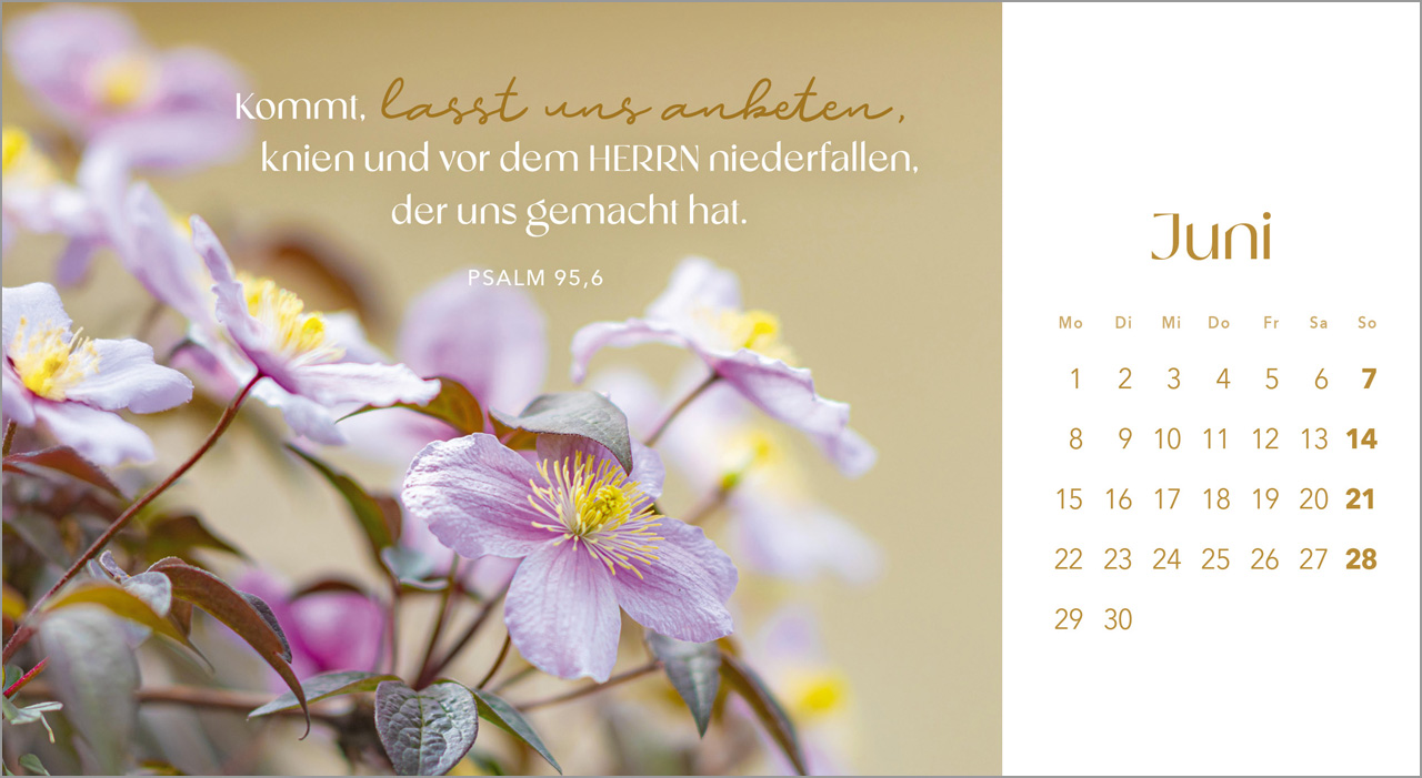 Erlebe die Schönheit der Schöpfung mit unserem Postkartenkalender „Augenblicke der Anbetung“ für das Jahr 2026. Dieser dekorative Tischkalender fasziniert mit atemberaubenden Blumenmotiven, die nicht nur das Auge erfreuen, sondern auch deine Seele berühren. Jeder Monat wird von sorgfältig ausgewählten Bibelversen begleitet, die dich dazu inspirieren, Gott, den Schöpfer, zu preisen und in Anbetung zu verweilen.