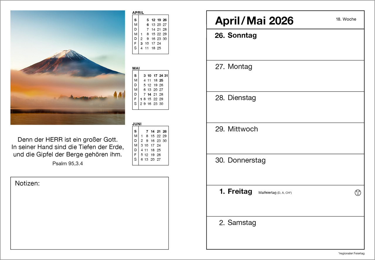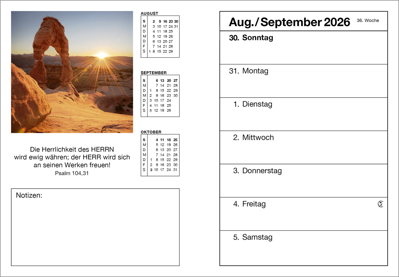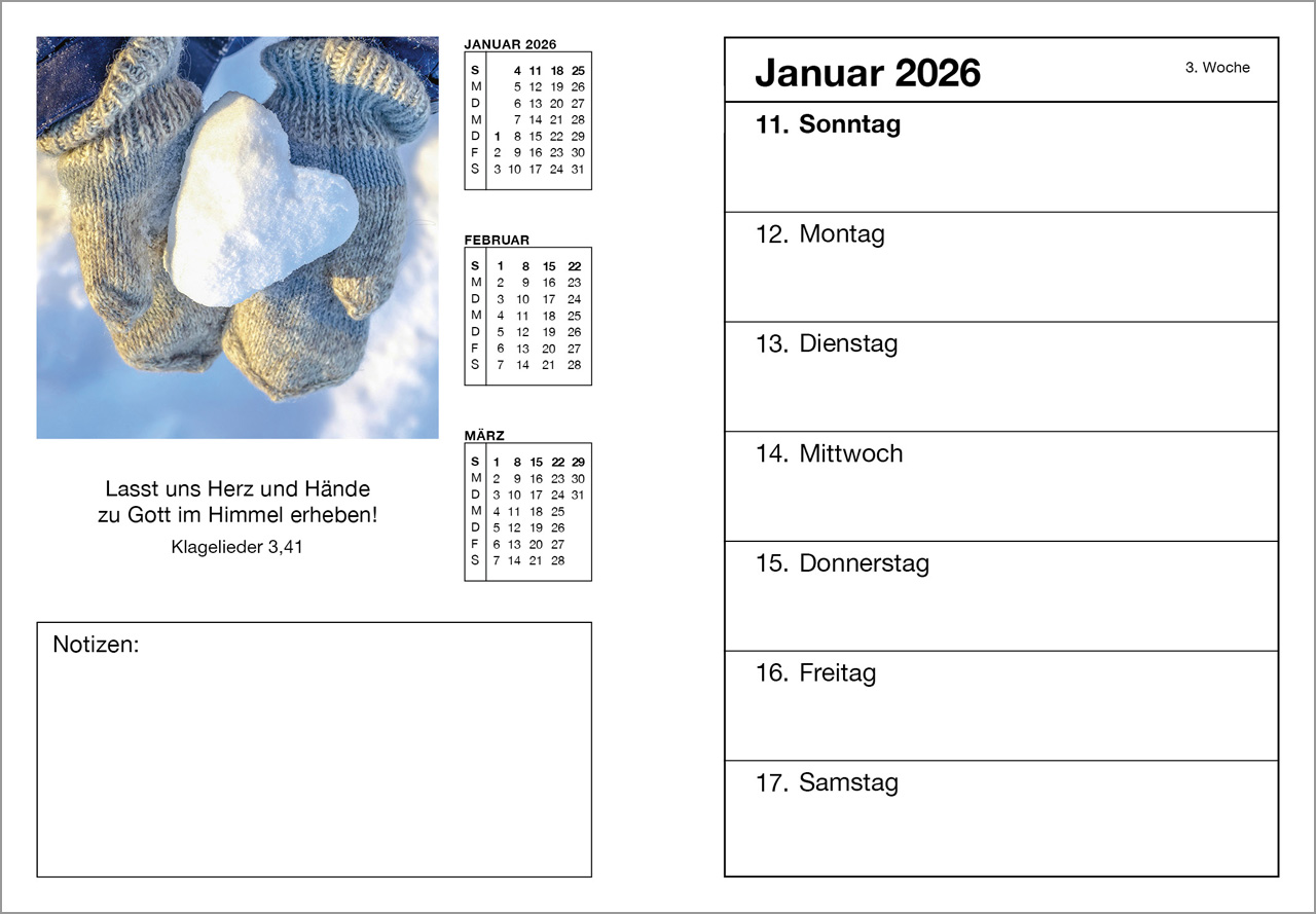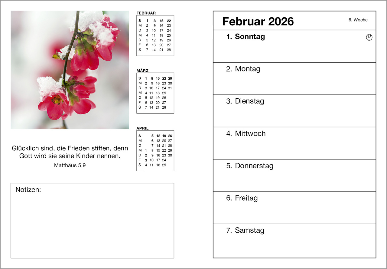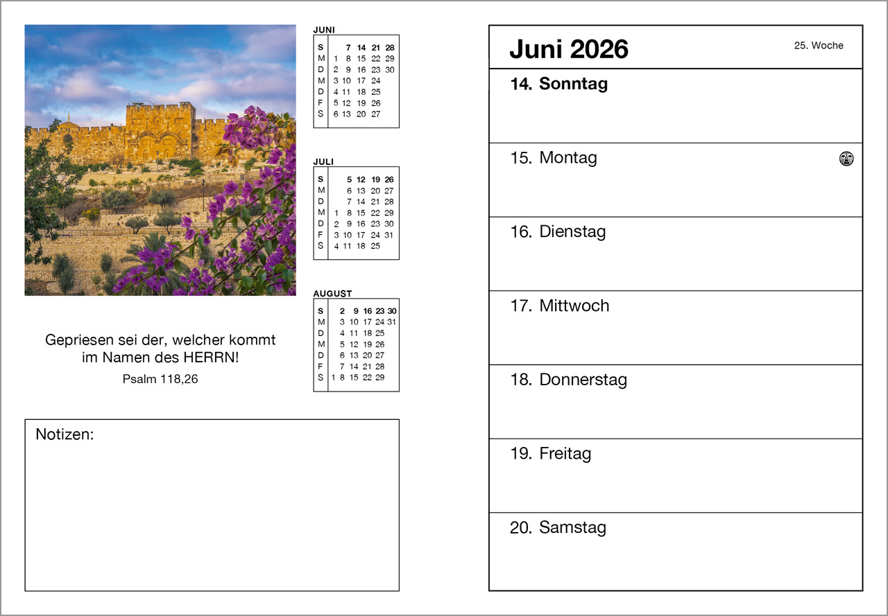 Mit 128 Seiten bietet die Agenda 54 farbige Fotos, die dich jede Woche begleiten und mit Bibelversen bereichern. Die Wochenkalender ermöglichen es dir, deine Termine übersichtlich zu organisieren und Notizen direkt neben den jeweiligen Wochen einzutragen. Darüber hinaus findest du Feiertagsangaben, ein Register für Telefonnummern und Adressen sowie einen praktischen Jahresplaner für 2025 und 2026, der dir bei der Langzeitplanung hilft.