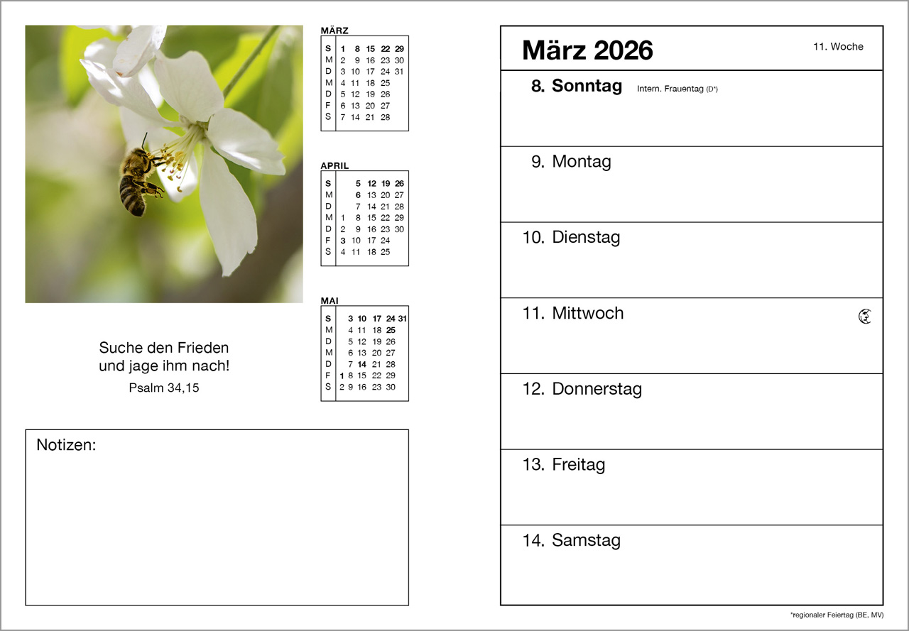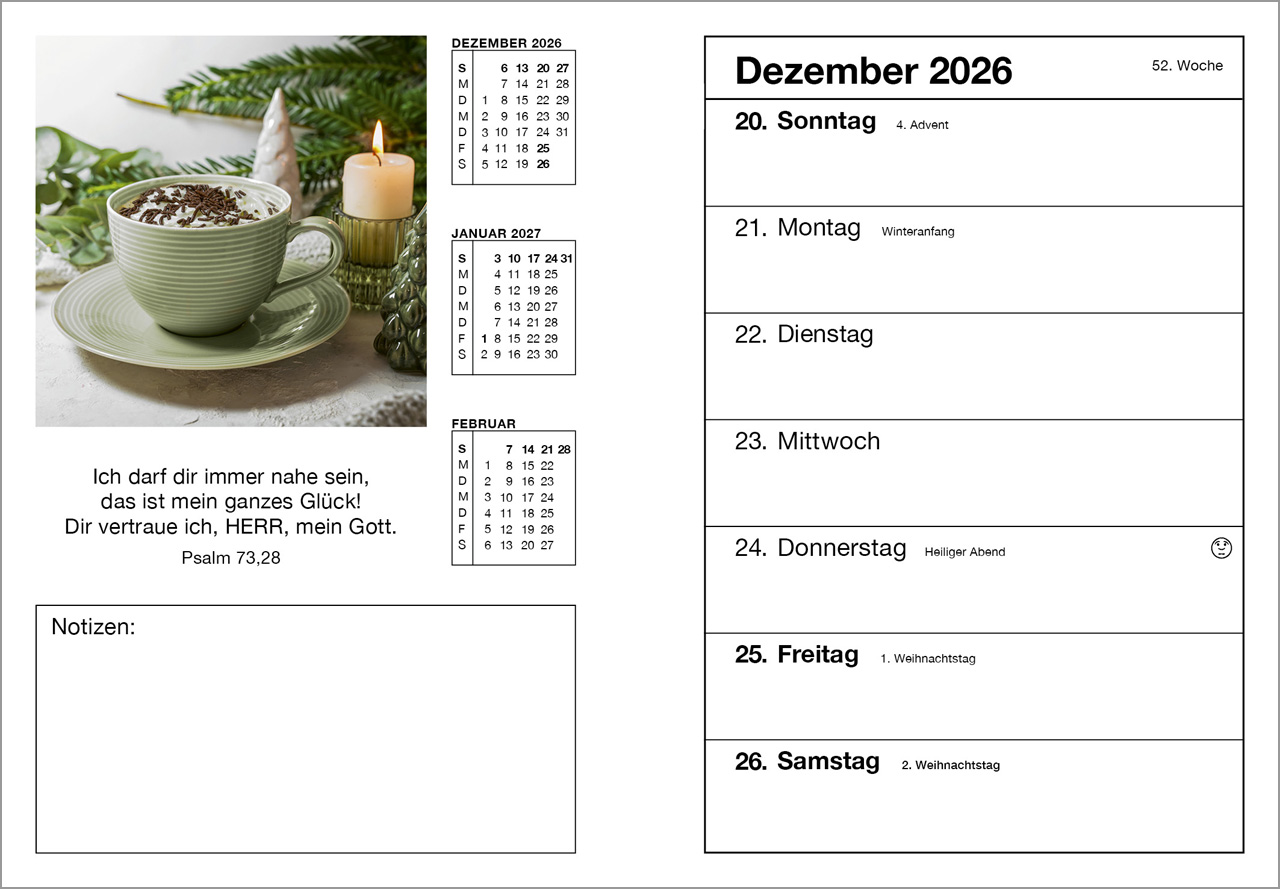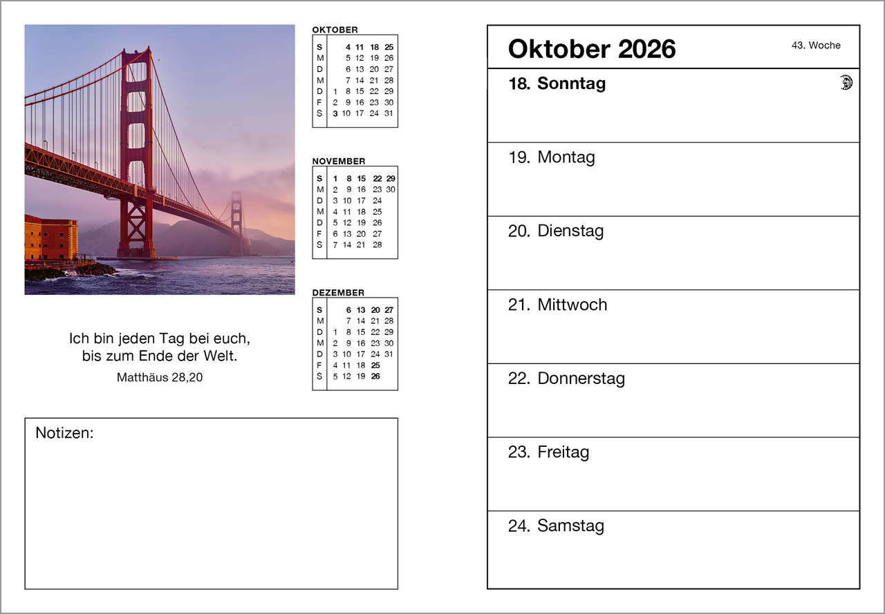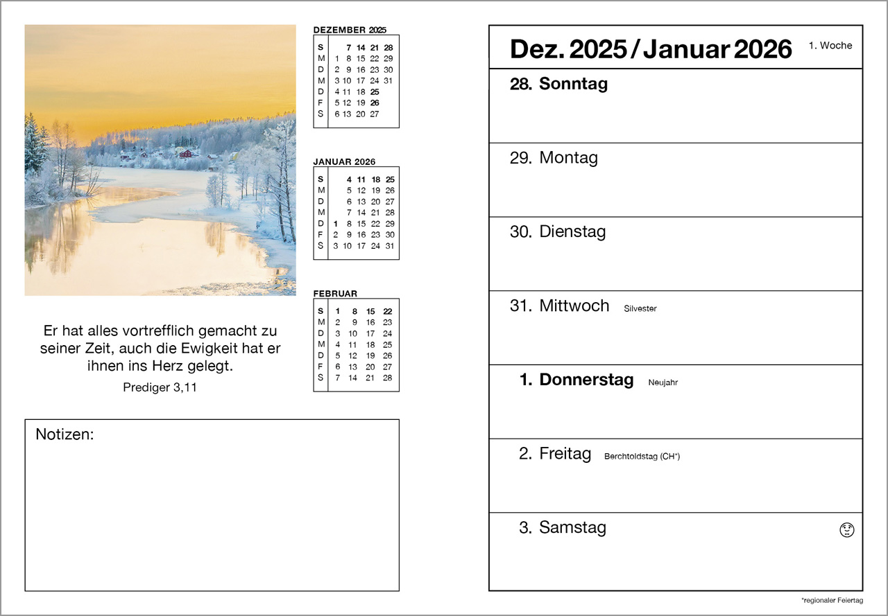 Mit 128 Seiten bietet die Agenda 54 farbige Fotos, die dich jede Woche begleiten und mit Bibelversen bereichern. Die Wochenkalender ermöglichen es dir, deine Termine übersichtlich zu organisieren und Notizen direkt neben den jeweiligen Wochen einzutragen. Darüber hinaus findest du Feiertagsangaben, ein Register für Telefonnummern und Adressen sowie einen praktischen Jahresplaner für 2025 und 2026, der dir bei der Langzeitplanung hilft.