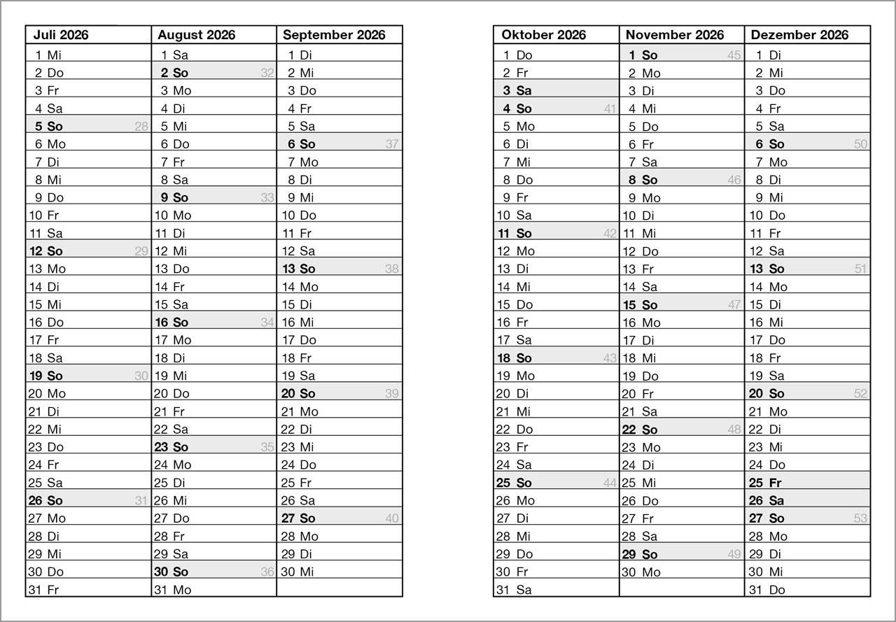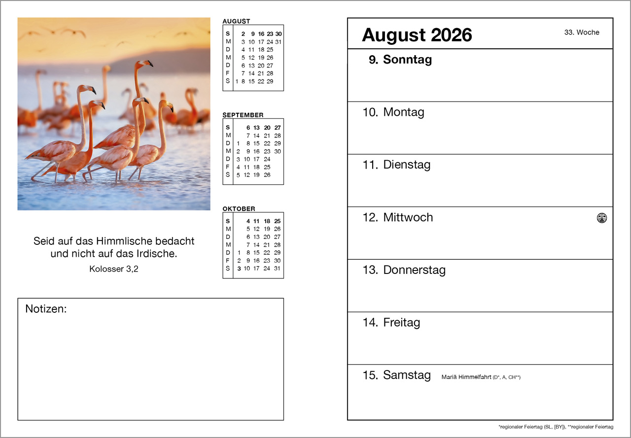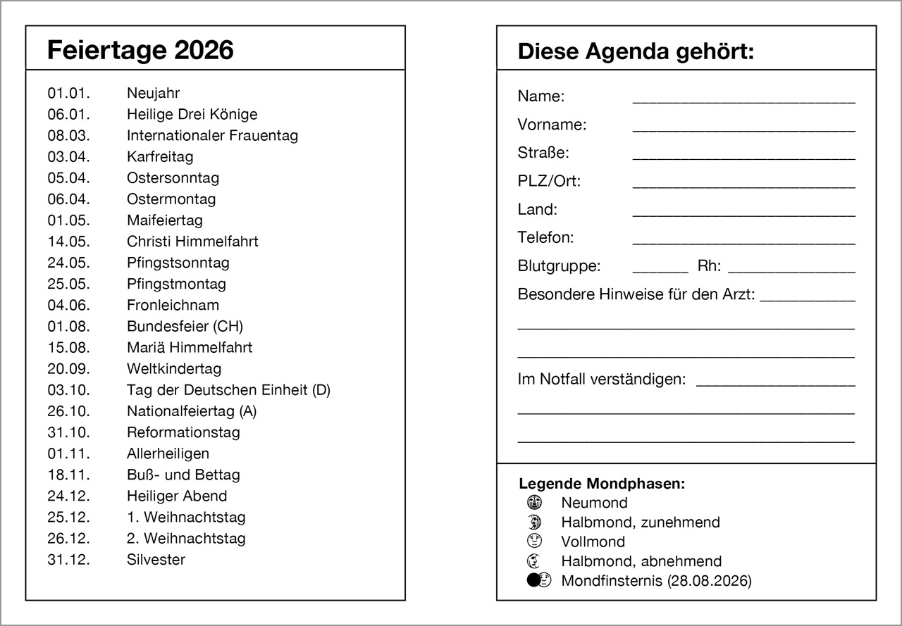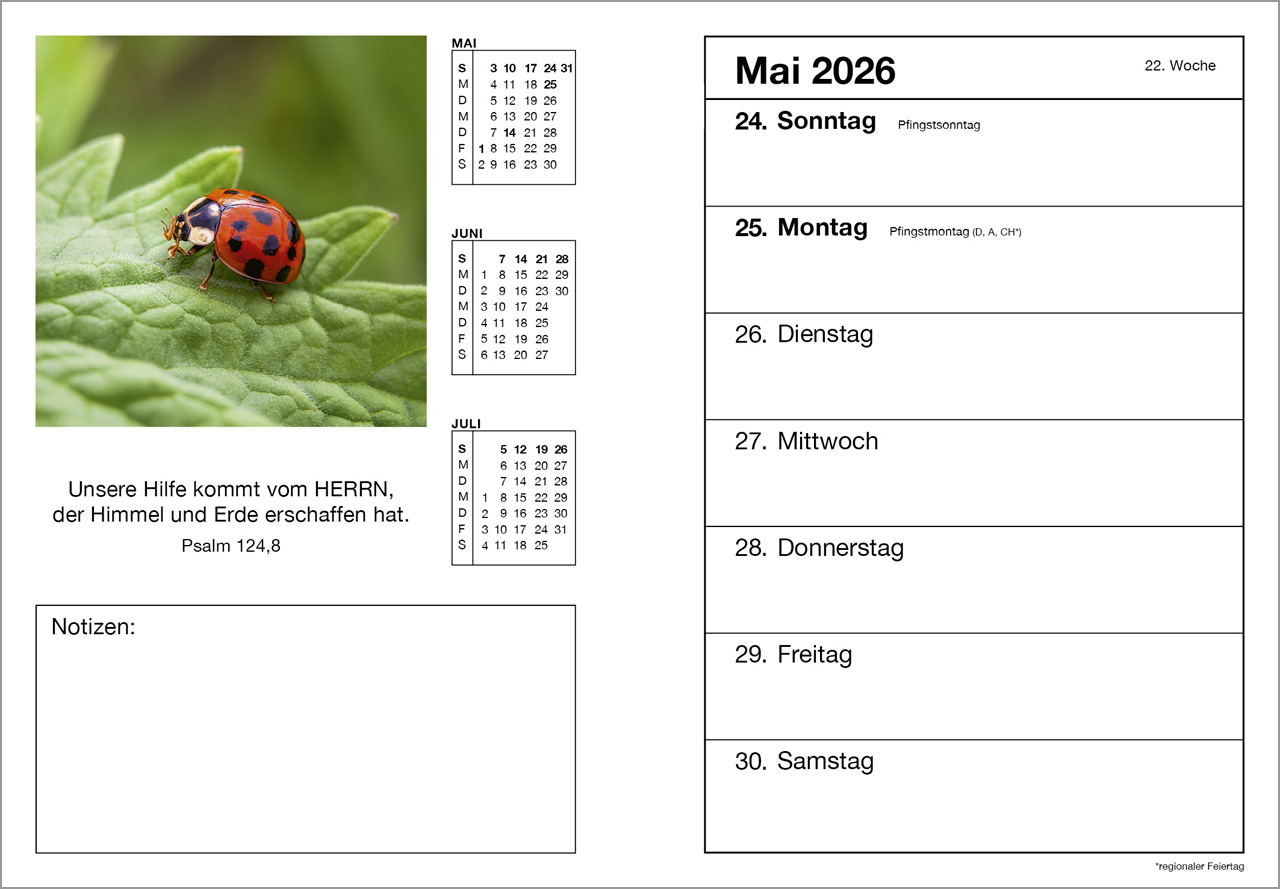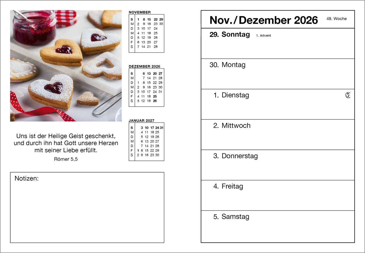 Mit 128 Seiten bietet die Agenda 54 farbige Fotos, die dich jede Woche begleiten und mit Bibelversen bereichern. Die Wochenkalender ermöglichen es dir, deine Termine übersichtlich zu organisieren und Notizen direkt neben den jeweiligen Wochen einzutragen. Darüber hinaus findest du Feiertagsangaben, ein Register für Telefonnummern und Adressen sowie einen praktischen Jahresplaner für 2025 und 2026, der dir bei der Langzeitplanung hilft.