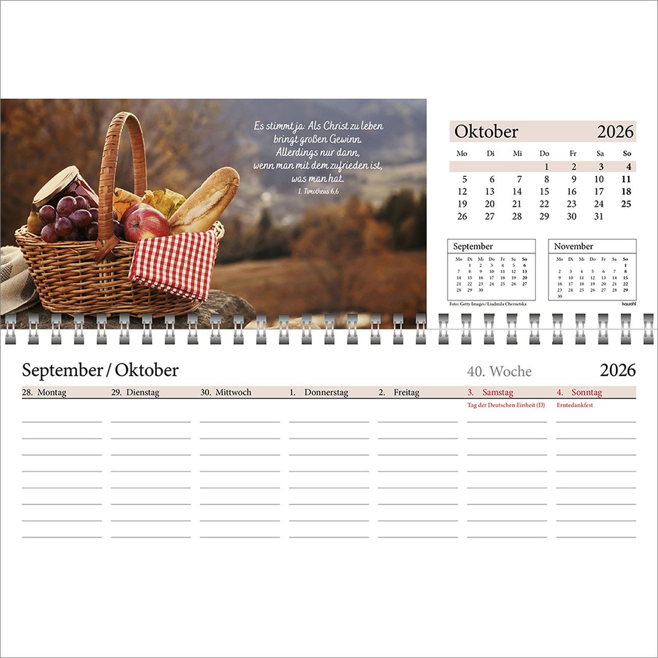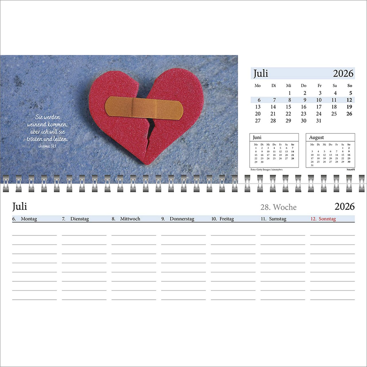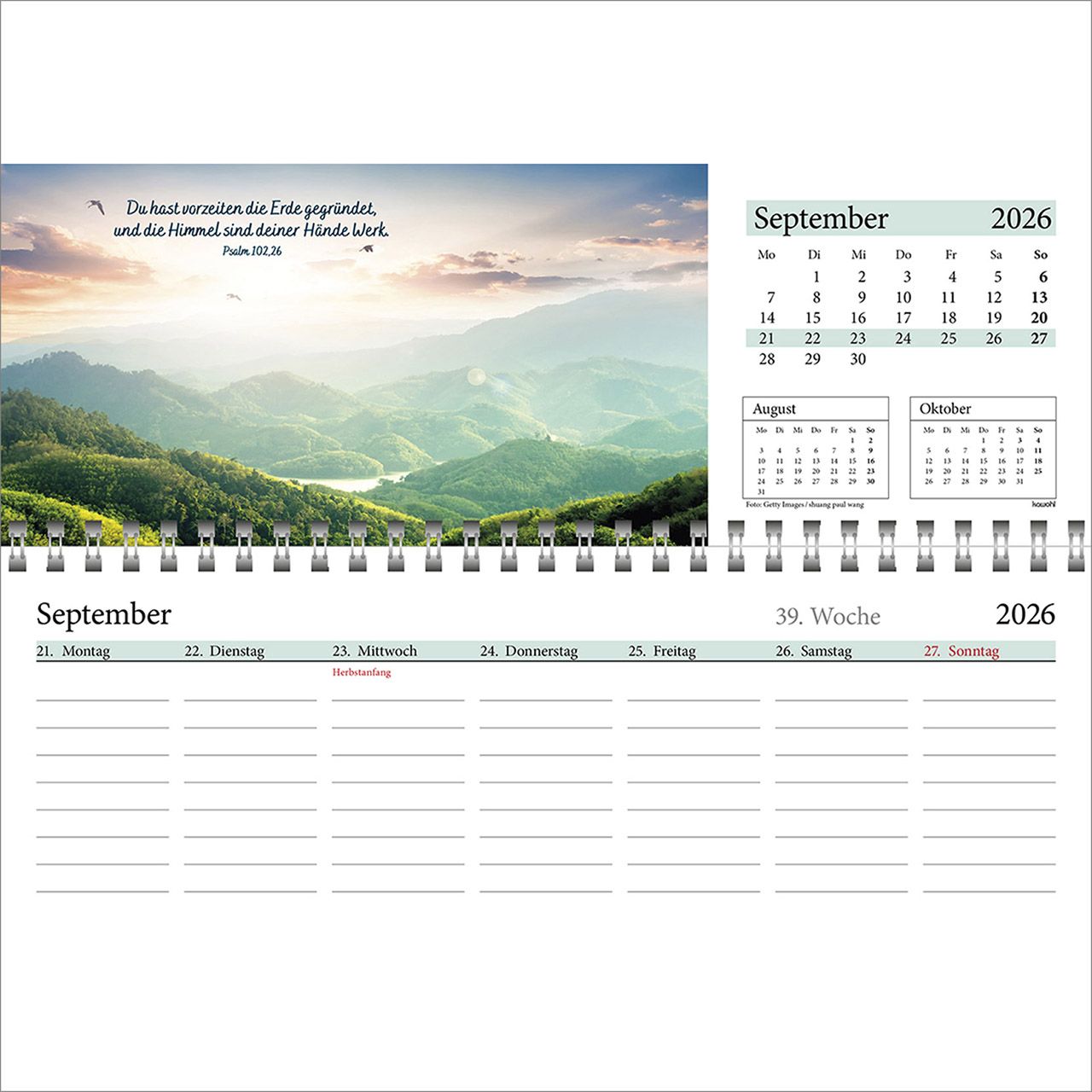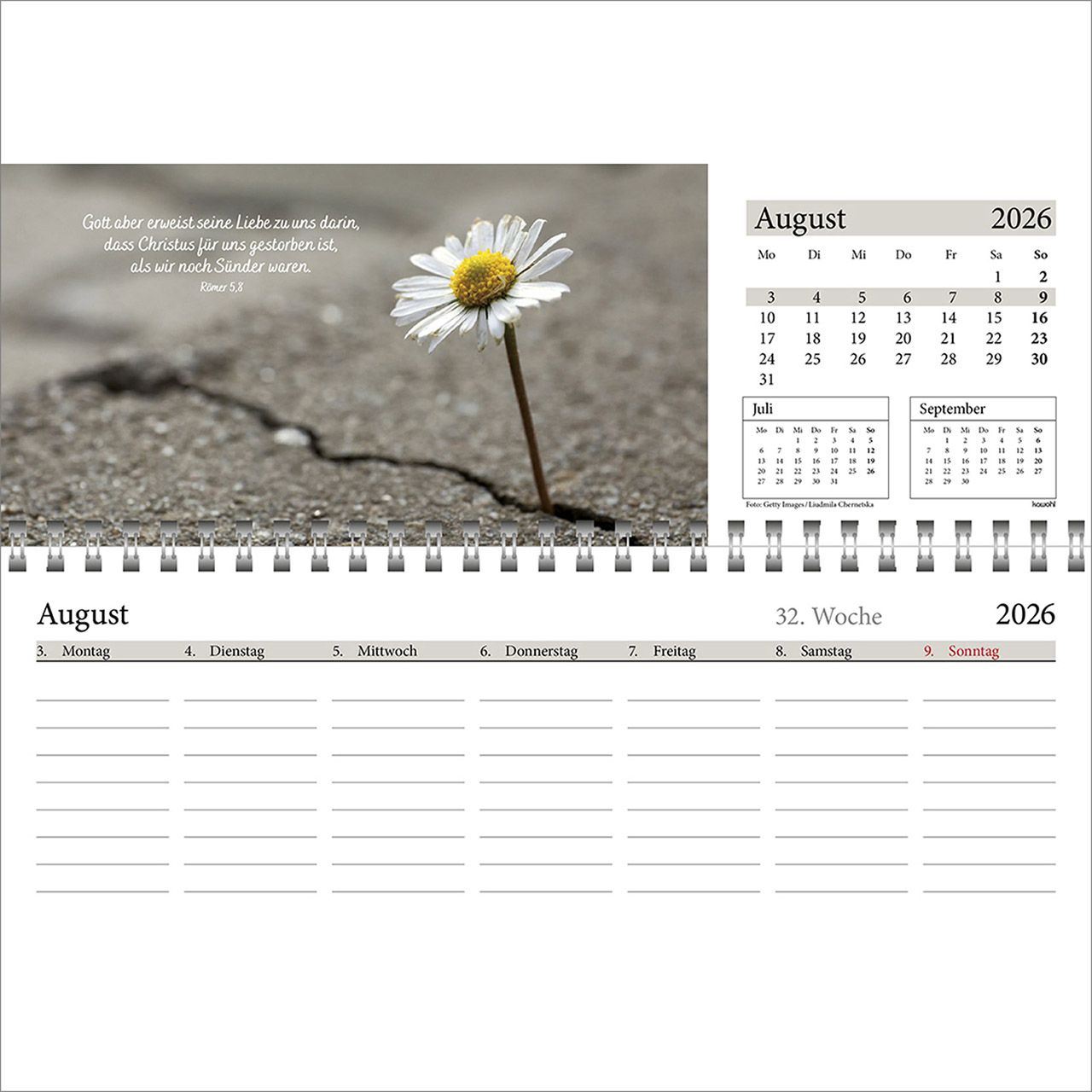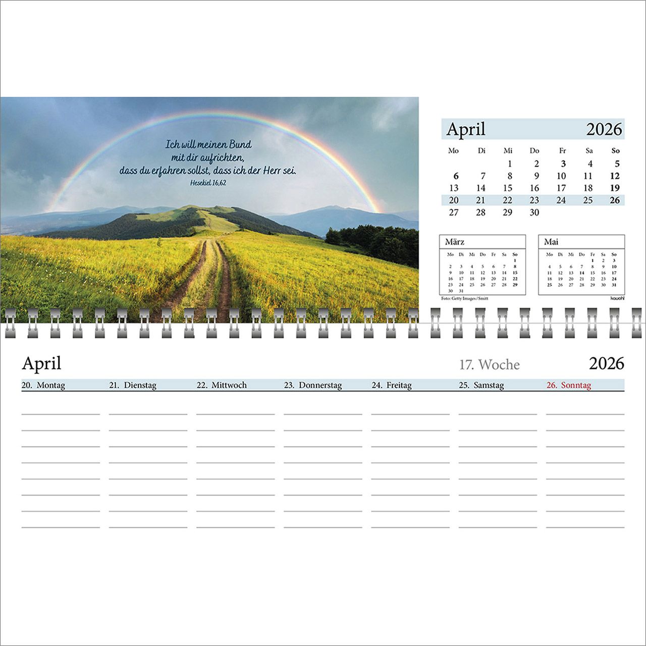Dieser Tisch-Quer-Kalender bietet zugleich reichlich Platz für Eintragungen und einen Überblick über drei Monate wie auch ein wohltuendes Bild mit Bibelvers. So haben Sie alle Termine im Griff und schaffen sich auf Ihrem Schreibtisch eine Stelle, die Sie gerne anschauen.