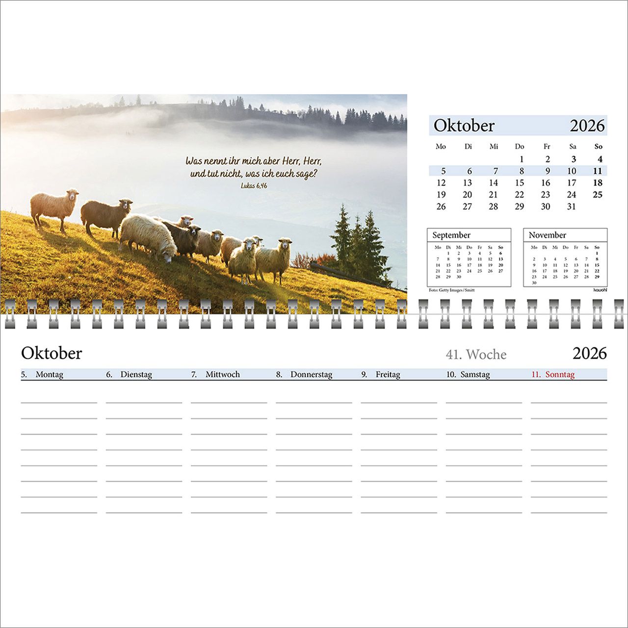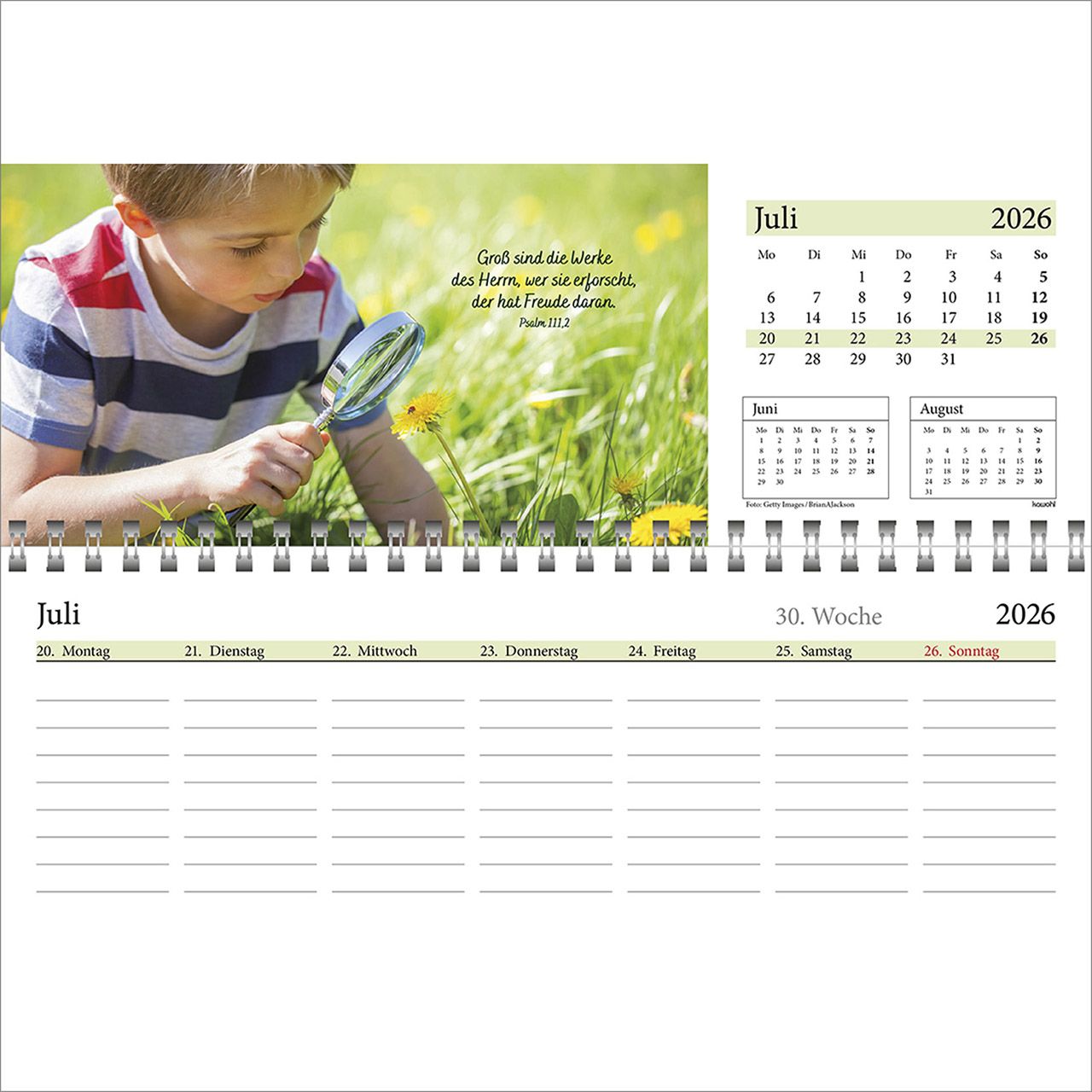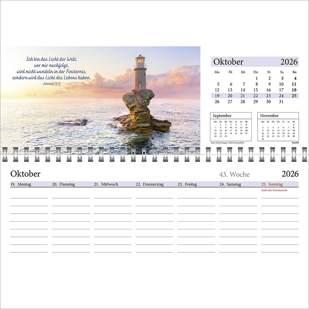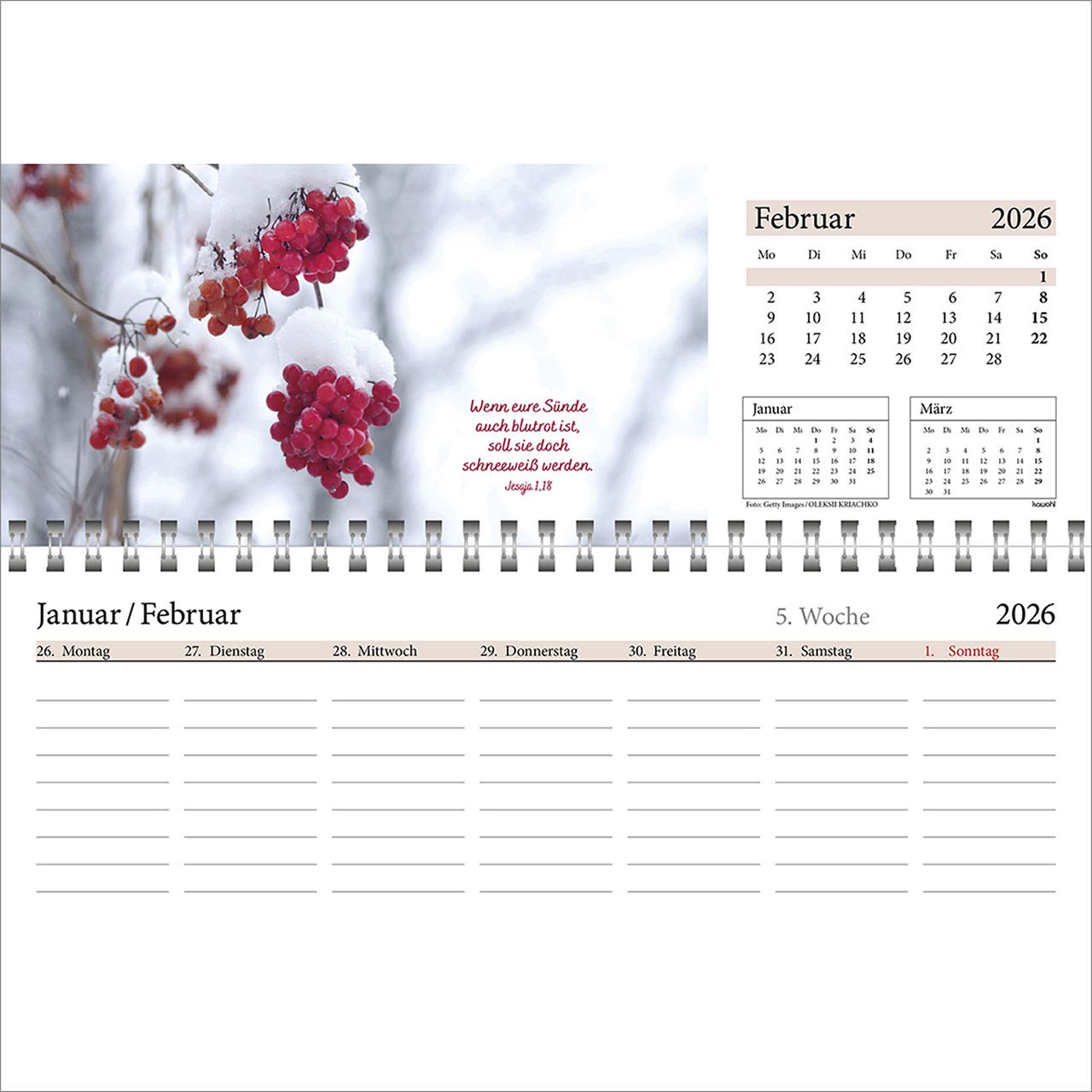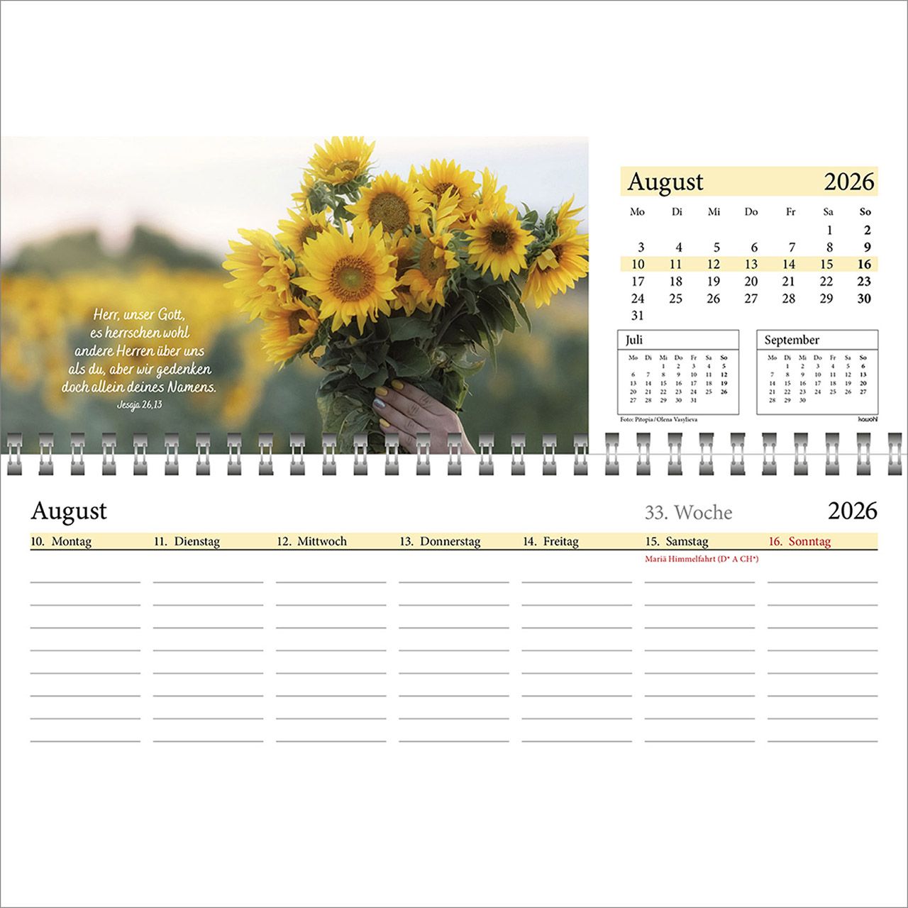 Dieser Tisch-Quer-Kalender bietet zugleich reichlich Platz für Eintragungen und einen Überblick über drei Monate wie auch ein wohltuendes Bild mit Bibelvers. So haben Sie alle Termine im Griff und schaffen sich auf Ihrem Schreibtisch eine Stelle, die Sie gerne anschauen.
