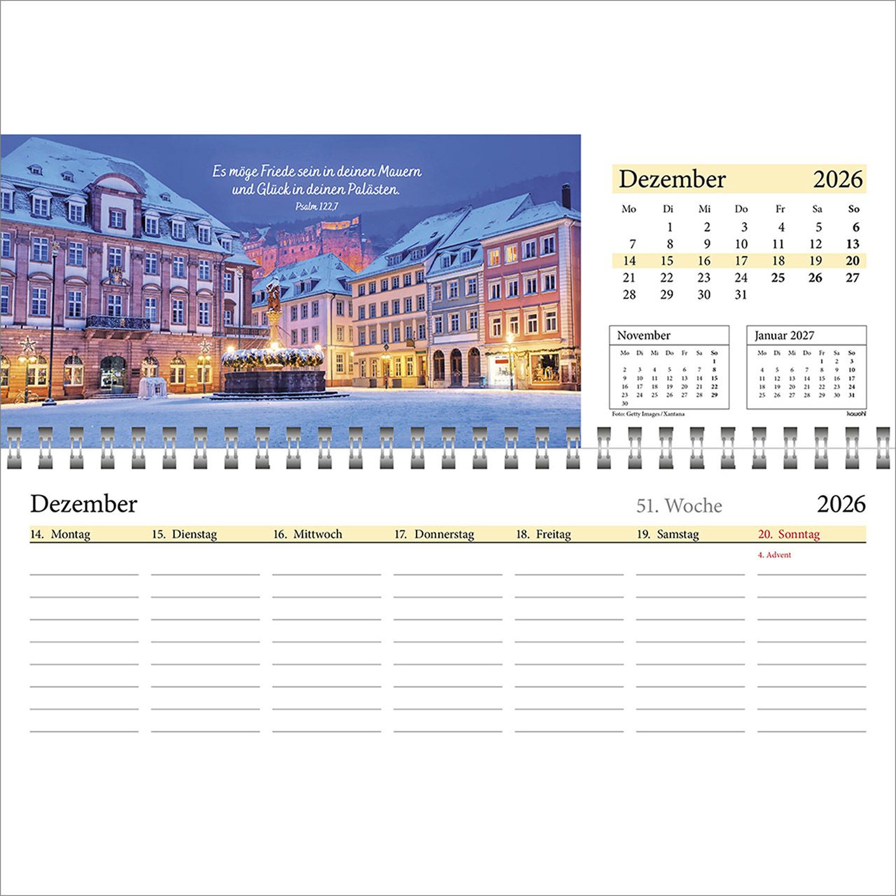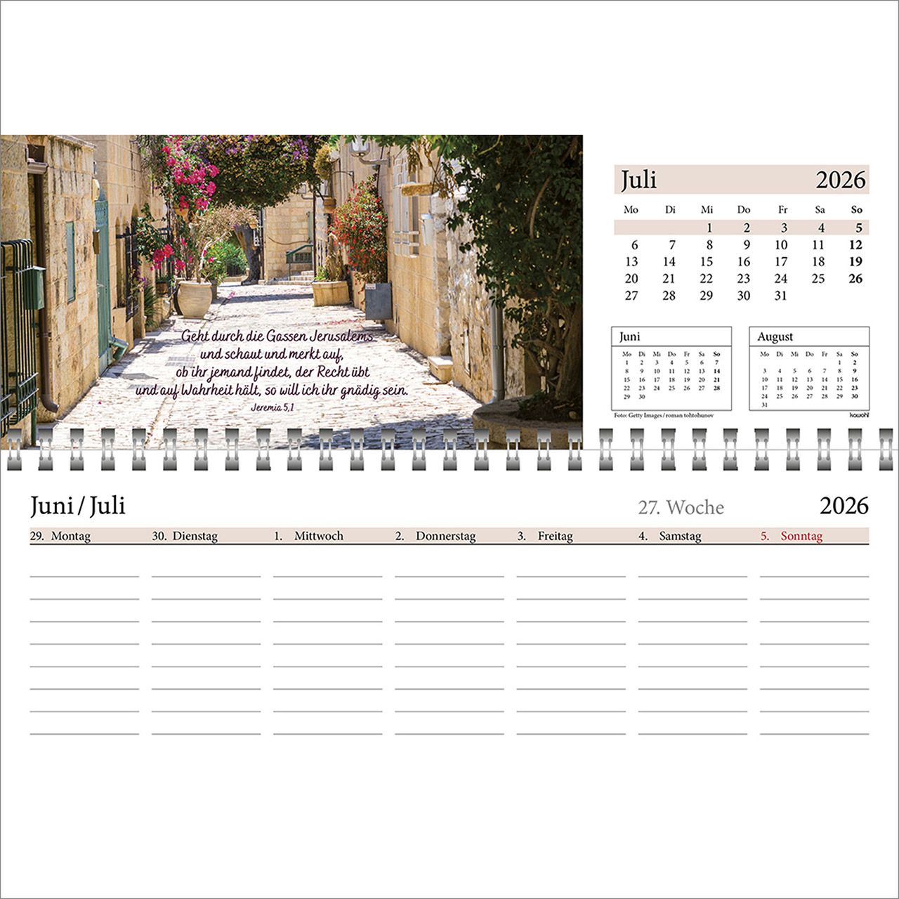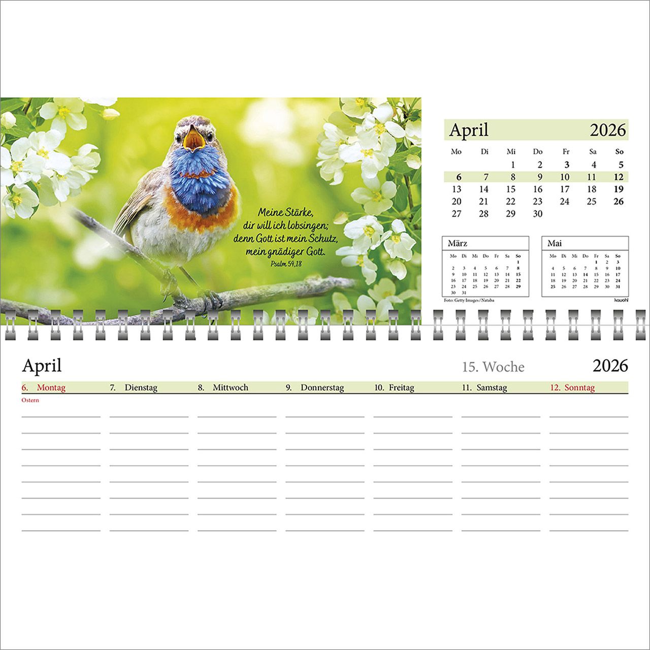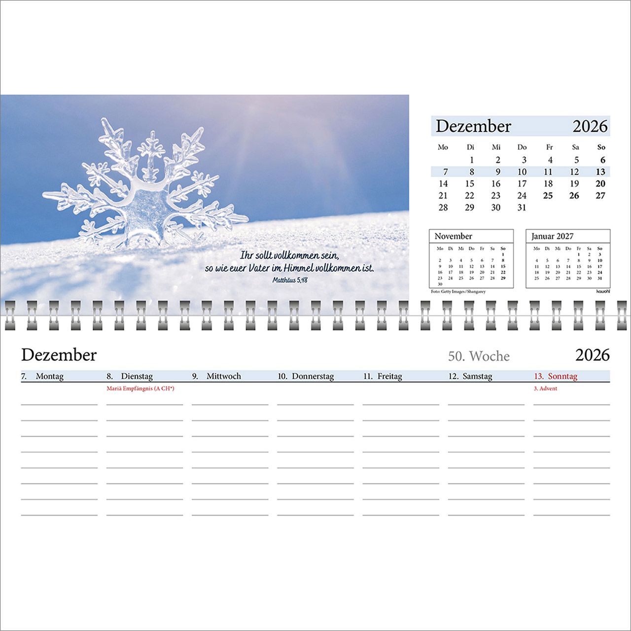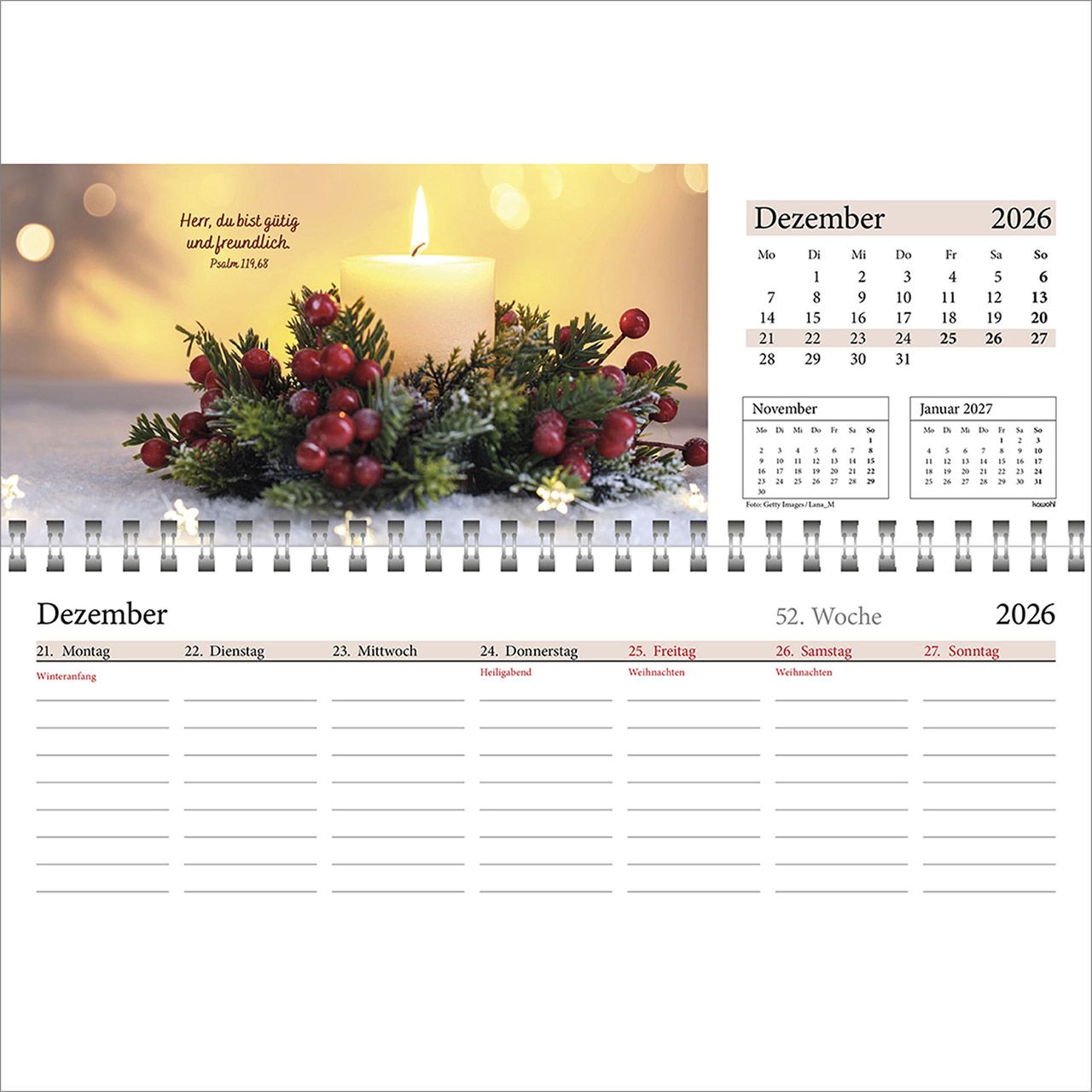 Dieser Tisch-Quer-Kalender bietet zugleich reichlich Platz für Eintragungen und einen Überblick über drei Monate wie auch ein wohltuendes Bild mit Bibelvers. So haben Sie alle Termine im Griff und schaffen sich auf Ihrem Schreibtisch eine Stelle, die Sie gerne anschauen.