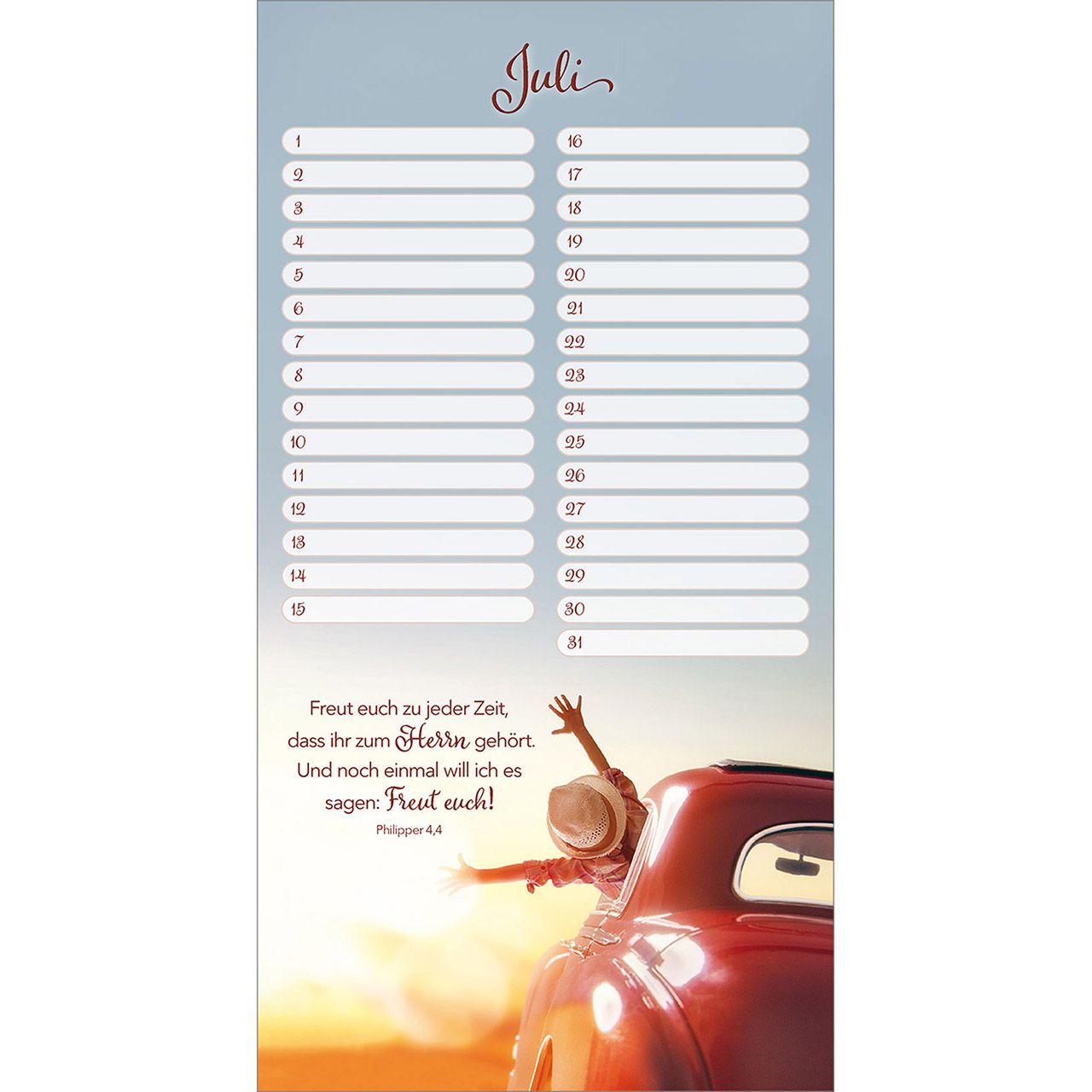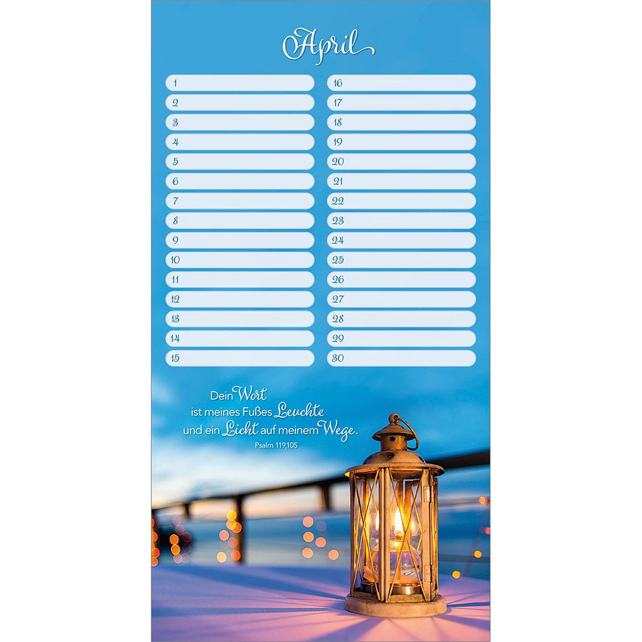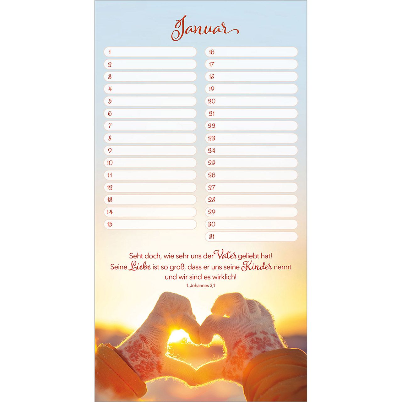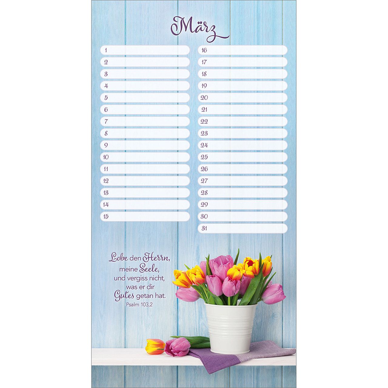 - Mit diesem wunderschönen Wandkalender vergessen Sie nie wieder Geburts- und Jahrestage. Stimmungsvolle Bilder mit wertvollen Bibelversen begleiten Sie jedes Jahr aufs Neue und sind im praktischen Hochformat ein echter Blickfang. Zusätzlich gibt es genügend Spalten um alle Geburts-, Fest- oder Trauertage von Freunden und Verwandten einzutragen. Dieser Kalender ist somit nicht nur praktisch, sondern auch sehr dekorativ und ermutigend. Ein wertvoller Begleiter für viele Jahre.