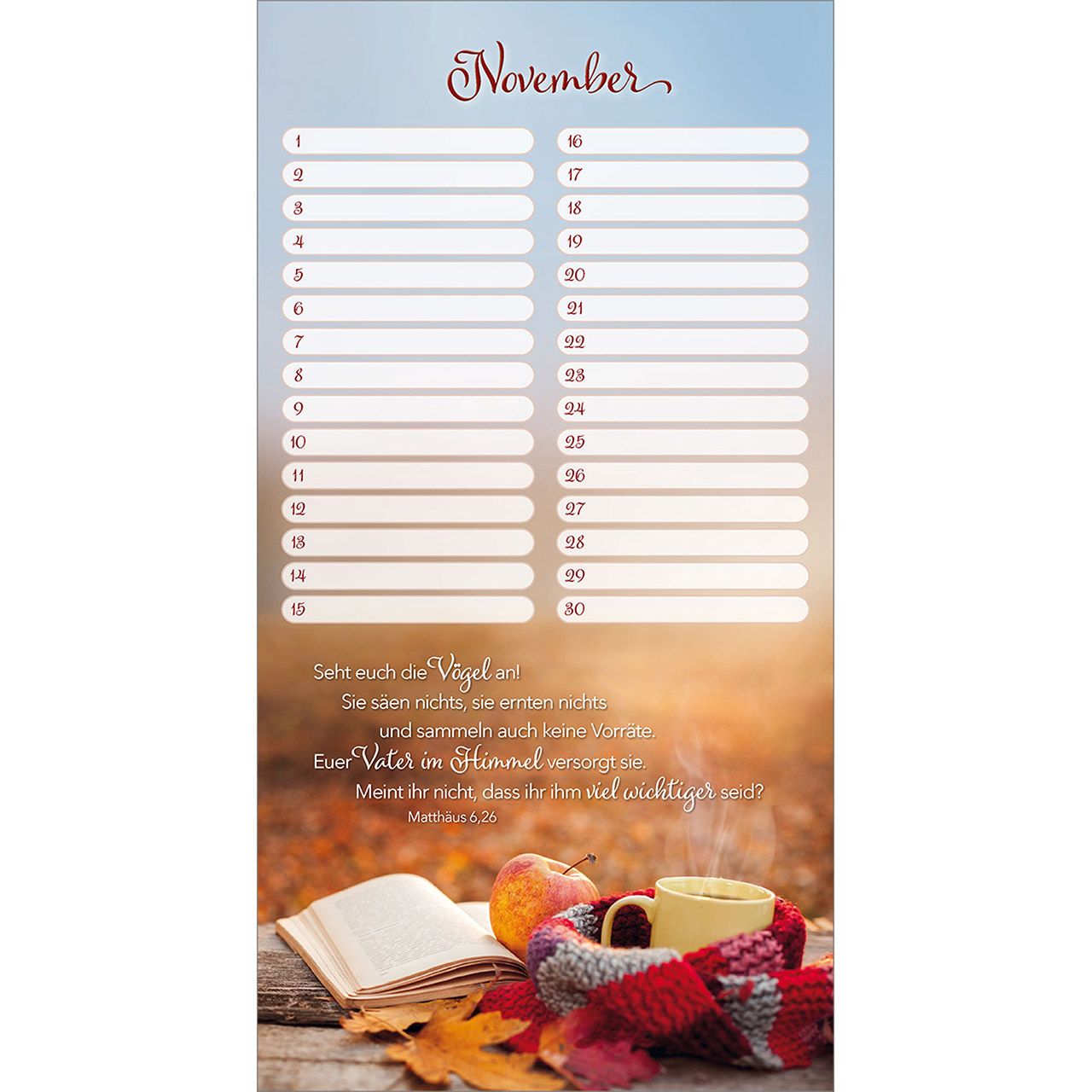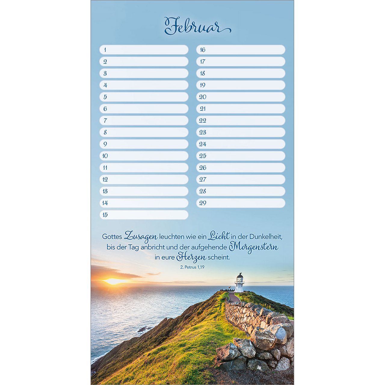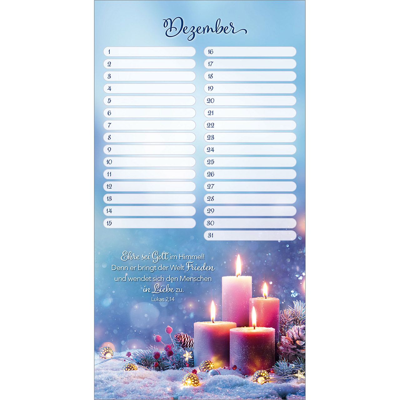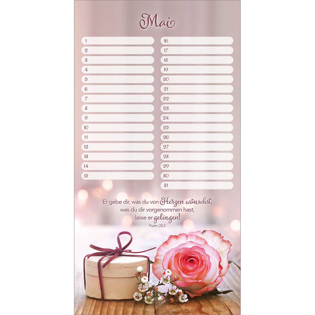 - Mit diesem wunderschönen Wandkalender vergessen Sie nie wieder Geburts- und Jahrestage. Stimmungsvolle Bilder mit wertvollen Bibelversen begleiten Sie jedes Jahr aufs Neue und sind im praktischen Hochformat ein echter Blickfang. Zusätzlich gibt es genügend Spalten um alle Geburts-, Fest- oder Trauertage von Freunden und Verwandten einzutragen. Dieser Kalender ist somit nicht nur praktisch, sondern auch sehr dekorativ und ermutigend. Ein wertvoller Begleiter für viele Jahre.