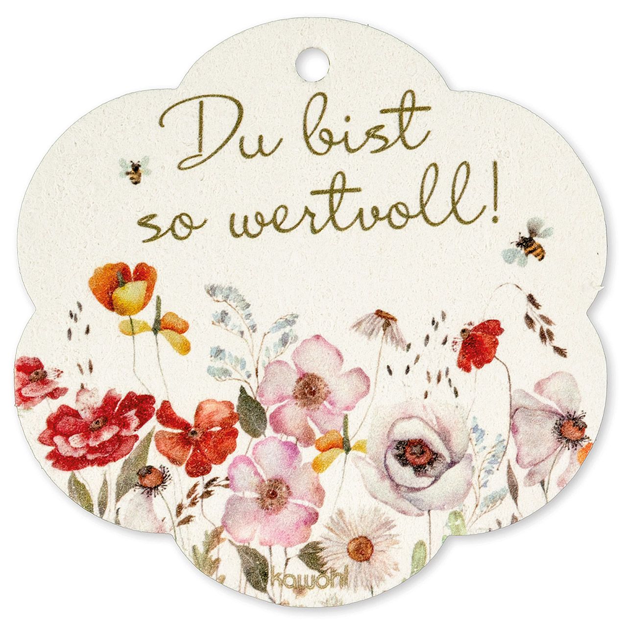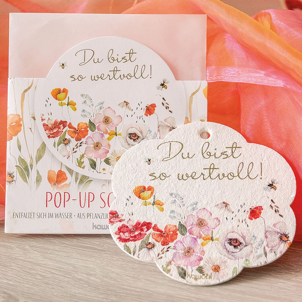 Verpackt in Transparentpapier (11 x 11,5 cm) mit bedruckter Banderole. - Text: Du bist so wertvoll!