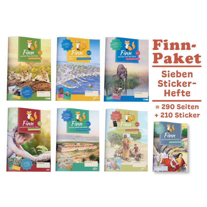 Das Finn-PaketDieses Paket beinhaltet folgende sieben Sticker-Mitmach-Hefte:Finn und die Tiere der Bibel – No. 1DIN-A4, 35 Seiten • Best.-Nr. 257873Finn und die Tiere der Bibel – No. 2DIN-A4, 40 Seiten • Best.-Nr. 257877Finn und die Pflanzen der Bibel – No. 3DIN-A4, 40 Seiten • Best.-Nr. 257878 Finn und die Bauwerke der Bibel – No. 4DIN-A4, 48 Seiten • Best.-Nr. 257890 Finn und die Städte der Bibel – No. 5DIN-A4, 48 Seiten • Best.-Nr. 257659 Finn und die Berufe der Bibel – No. 6DIN-A4, 48 Seiten • Best.-Nr. 258004Finn und die größte Entdeckung – Mini-Mitmachheft (zur Ostergeschichte)DIN-A5, 30 Seiten • Best.-Nr. 257667Jedes Heft enthält außerdem die gute Botschaft, in kindgerechter Weise erklärt.