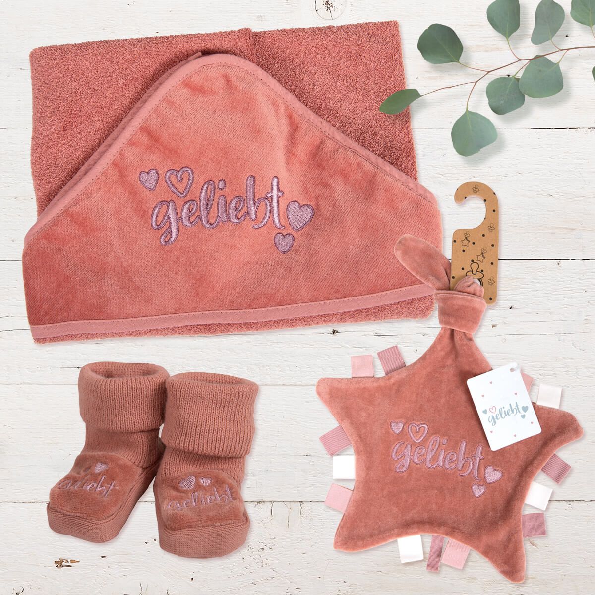 Das Baby-Schmusetuch in der Trendfarbe altrosa mit niedlichem Stick "geliebt" und kleinen Herzen auf der samtigen Velours-Oberfläche hat eine ideale Größe. Ein besonders liebevolles Geschenk zur Geburt oder Taufe (auch in salbei erhältlich).