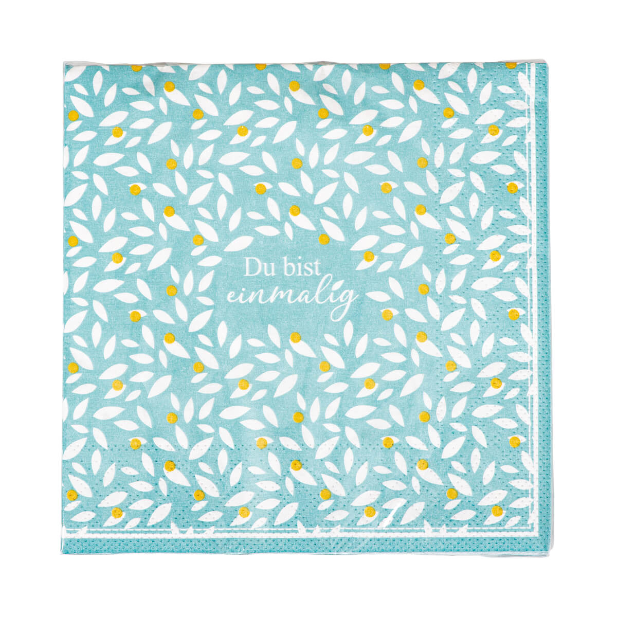 Diese schönen dekorativen Servietten mit Text: "Du bist einmalig", mit kleinen Blättchen und goldfarbenen Pünktchen runden einen gedeckten Tisch ab.