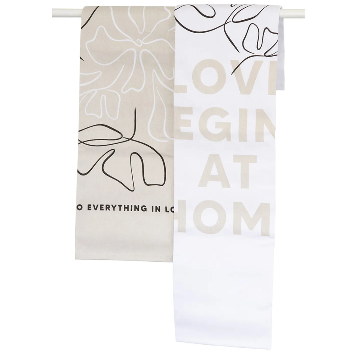 Die Geschirrtücher haben nicht nur ein tolles Design, sie setzen ein Statement in jeder Küche. Die Aufdrucke »Love begins at home« und »Do everything in love« machen das Set auch zu einem wunderbaren Hochzeitsgeschenk. Die Tücher sind in einem dekorativen Karton mit Kordel verpackt. Sie sind aus 100% Baumwolle und jeweils ca. 40 x 60 cm groß.