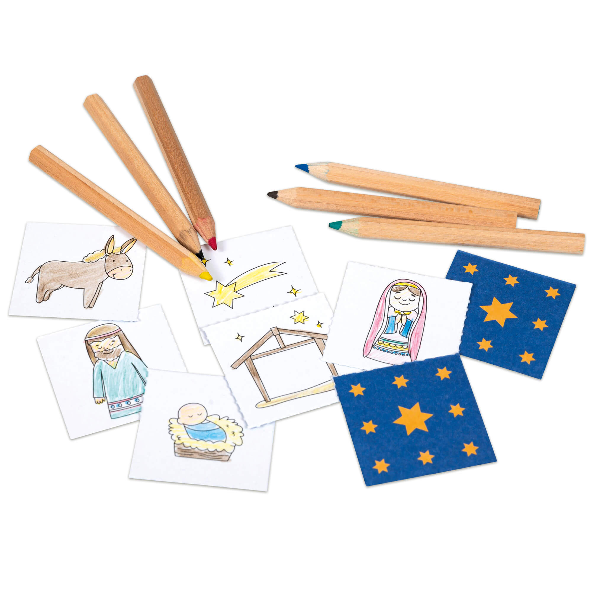 Großen Spielspaß bietet dieses Set aus 26 Memo-Kärtchen und sechs Buntstiften in einer kompakten Schachtel. Wer mag, malt die Memokärtchen mit den weihnachtlichen Krippemotiven zuerst aus. Danach gilt es, die passenden Bilderpaare zu finden und aufzudecken. Größe Schachtel: 9x9x1 cm, Größe Memokärtchen: 4,2x4,2 cm (1-3 Spieler, ab 4 Jahren)