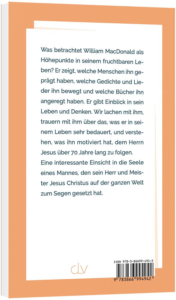 Was betrachtet William MacDonald als Höhepunkte in seinem fruchtbaren Leben? Er zeigt, welche Menschen ihn geprägt haben, welche Gedichte und Lieder ihn bewegt und welche Bücher ihn angeregt haben. Er gibt Einblick in sein Leben und Denken. Wir lachen mit ihm, trauern mit ihm über das, was er in seinem Leben sehr bedauert, und verstehen, was ihn motiviert hat, dem Herrn Jesus über 70 Jahre lang zu folgen.