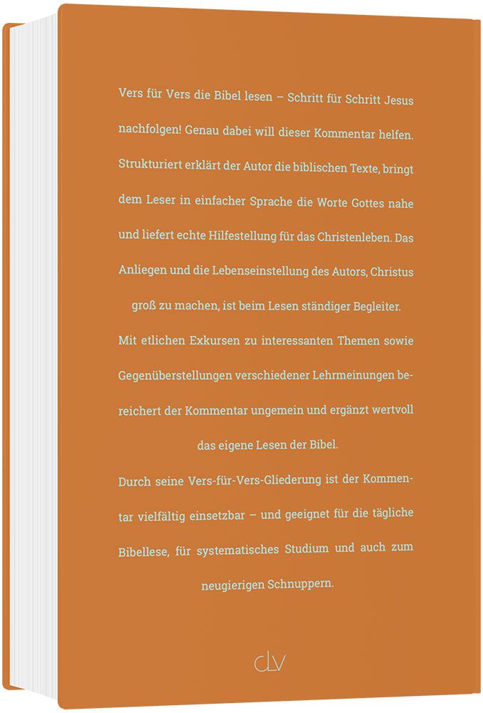 Vers für Vers die Bibel lesen – Schritt für Schritt Jesus nachfolgen! Genau dabei will dieser Kommentar helfen. Strukturiert erklärt der Autor die biblischen Texte, bringt dem Leser in einfacher Sprache die Worte Gottes nahe und liefert echte Hilfestellung für das Christenleben. Das Anliegen und die Lebenseinstellung des Autors, Christus groß zu machen, ist beim Lesen ständiger Begleiter.